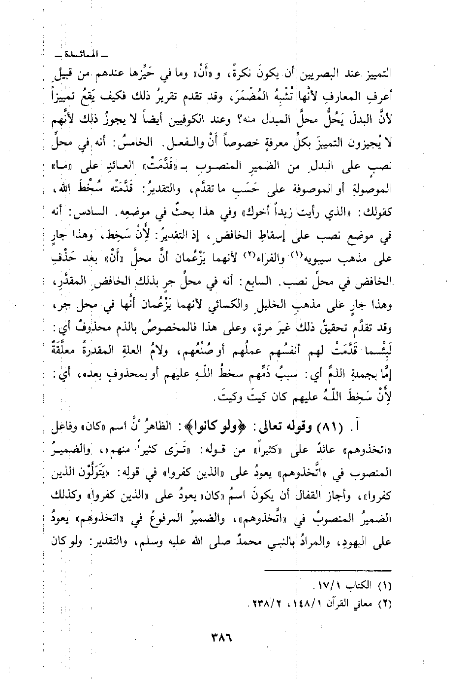 التمييز عند البصريين ان يكونَ نكرةً، و «أَنْ» وما في حَيِّزها عندهم من قبيلِ أعرفِ المعارفِ لأنَّها تُشْبِهُ المُضْمَرَ، وقد تقدم تقريرُ ذلك فيكف يَقعُ تمييزاً لأنَّ البدلَ يَحُلُّ محلَّ المبدل منه؟ وعند الكوفيين أيضاً لا يجوزُ ذلك لأنَّهم لا يُجيزون التمييزَ بكلِّ معرفةٍ خصوصاً أَنْ والفعل. الخامسُ: أنه في محلِّ نصبٍ على البدلِ من الضمير المنصوبِ ب «قَدَّمَتْ» العائدِ على «ما» الموصولة أو الموصوفة على حَسَبِ ما تقدَّم، والتقديرُ: قَدَّمَتْه سُخْط الله، كقولك: «الذي رأيت زيداً أخوك» وفي هذا بحثٌ في موضعِه. السادس: أنه موضع نصب على إسقاطِ الخافضِ، إذ التقديرُ: لأَنْ سَخِط، وهذا جارٍ على مذهبه سيبويه والفراء لأنهما يَزْعُمان أنَّ محلَّ «أَنْ» بعد حَذْفِ الخافض في محلِّ نصب. السابع: أنه في محلِّ جر بذلك الخافضِ المقدَّرِ، هذا جارٍ على مذهبِ الخليلِ والكسائي لأنهما يُزْعُمان أنَّهما في محل جر، وقد تقدَّم تحقيقُ ذلك غيرَ مرةٍ، وعلى هذا فالمخصوصُ بالذم محذوفٌ أي: لَبِئْسما قَدَّمَتْ لهم أنفسُهم عملُهم أو صُنْعُهم، ولامُ العلةِ المقدرةُ معلَّقَةٌ إمَّا بجملةِ الذمِّ أي: سببُ ذَمِّهم سخطُ اللهِ عليهم أو بمحذوفٍ بعده، أي: لأَنْ سَخِطَ اللهُ عليهم كان كيتَ وكيتَ.
