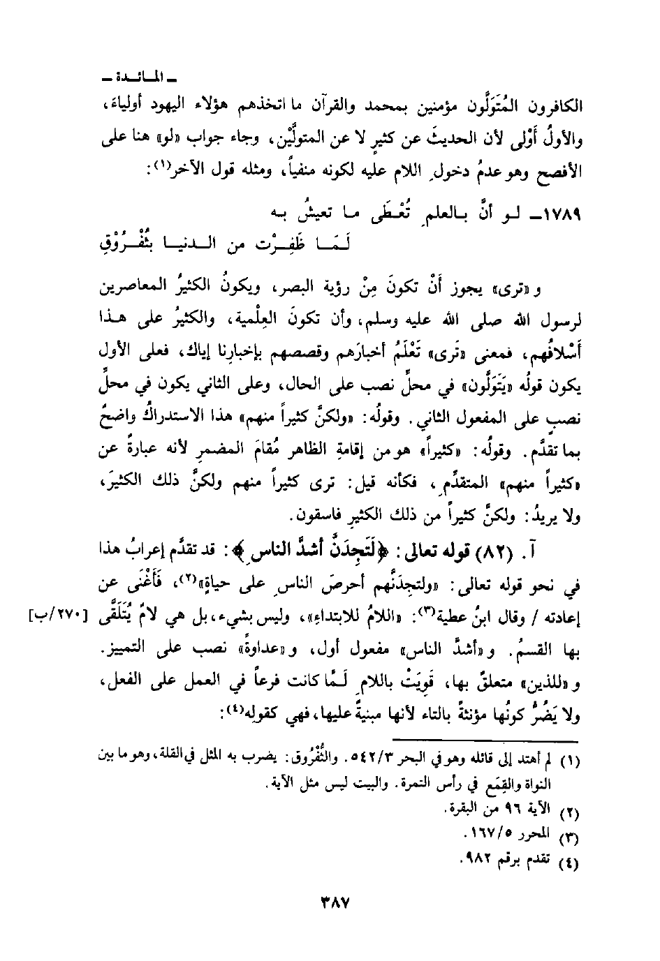 و «ترى» يجوز أَنْ تكونَ مِنْ رؤية البصر، ويكونُ المعاصرين لرسول الله صَلَّى اللهُ عَلَيْهِ وَسَلَّمَ، وأن تكونَ العِلْمية، والكثيرُ على هذا أَسْلافُهم، فمعنى «تَرى» تَعْلَمُ أخبارَهم وقصصهم بإخبارِنا إياك، فعلى الأول يكون قولُه «يَتَولَّون» في محلِّ نصب على الحال، وعلى الثاني يكون في محلِّ نصبٍ على المفعول الثاني: وقولُه: {ولكن كَثِيراً مِّنْهُمْ} هذا الاستدراكُ واضحٌ بما تقدَّم. وقولُه: «كثيراً» هو من إقامةِ الظاهر مُقامَ المضمرِ لأنه عبارةٌ عن «كثيراً منهم» المتقدِّمِ، فكأنه قيل: ترى كثيراً منهم ولكنَّ ذلك الكثيرَ، ولا يريدُ: ولكنَّ كثيراً من ذلك الكثيرِ فاسقون.