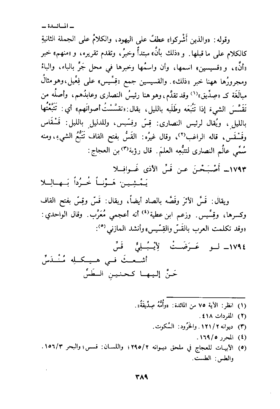 وقوله: {والذين أَشْرَكُواْ} عطفٌ على اليهود، والكلامُ على الجملة الثانيةِ كالكلام على ما قبلها. و «ذلك بأنَّ» مبتدأٌ وخبرُ، وتقدم تقريره، و «منهم» خبر «أنَّ» و «قسيسين» اسمها، وأن واسمُها وخبرها في محل جَرِّ بالباء، والباءُ ومجرورُها ههنا خبر «ذلك» والقسيسين جمع «قِسِّيس» على فِعِّيل، وهو مثالُ مبالَغَة ك «صِدِّيق» وقد تقدَّم وهو هنا رئيسُ النصارى وعابُدهم، وأصلُه من تَقَسِّسَ الشيءَ إذا تَتَّبَعَه وطَلَبه بالليل، يقال: «تقسَّسْتُ أصواتَهم» أي: تَتَبَّعْتُها بالليلِ، ويُقال لرئيس النصارى: قِسّ وقِسّيس، وللدليلِ بالليل: قَسْقَاس وقَسْقَس، قاله الراغب، وقال غيرُه: القَسُّ بفتح القاف تَتَبُّعُ الشيءِ، ومنه سُمِّي عالُم النصارى لتتبُّعِه العلمَ. قال رؤبه بن العجاج: