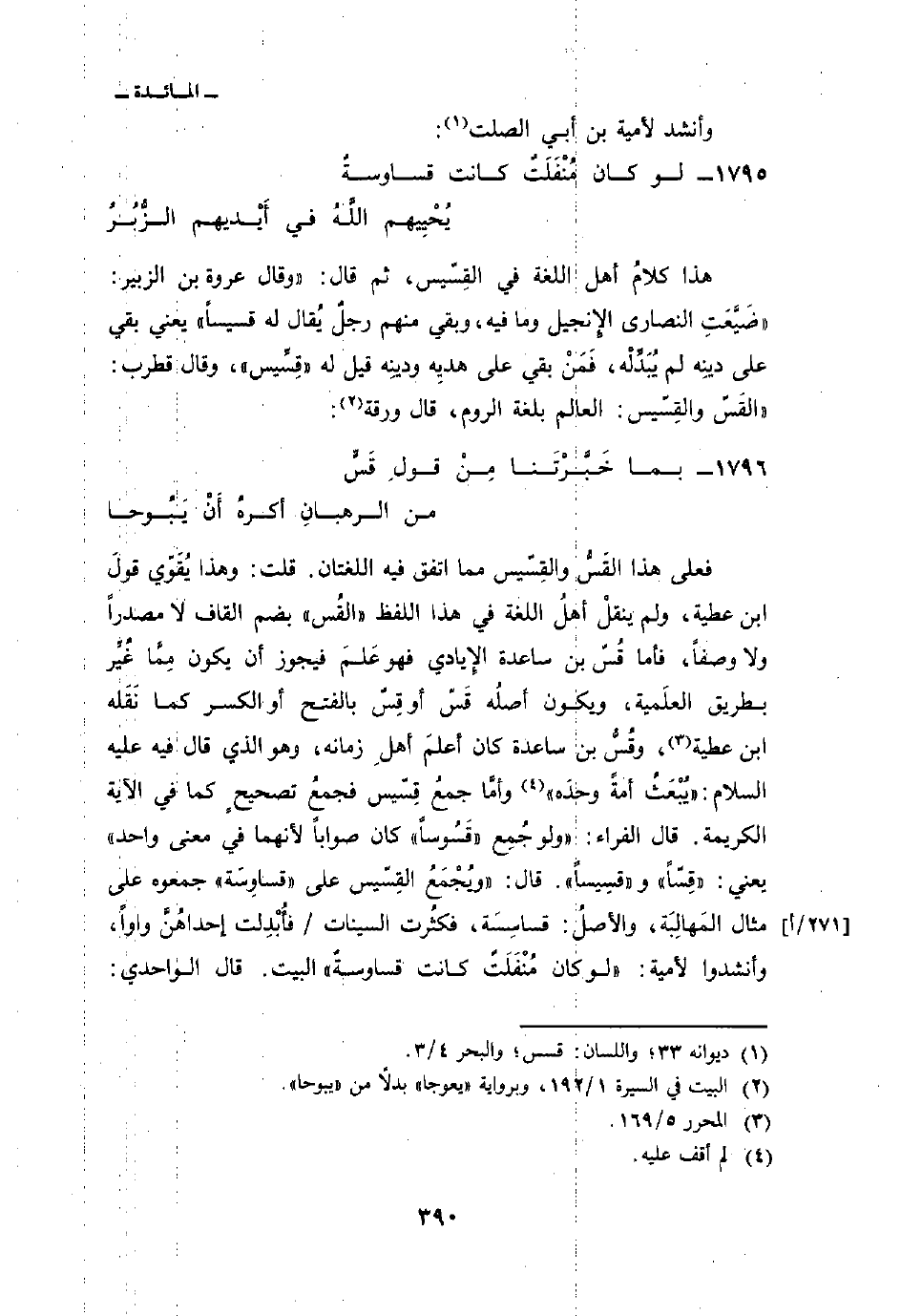 هذا كلامُ أهل اللغة في القِسّيس، ثم قال: «وقال عروة بن الزبير:» ضَيَّعَتِ النصارى الإِنجيل وما فيه، وبقي منهم رجلٌ يُقال له قسيساً «يعني بقي على دينِه لم يُبَدِّلْه، فَمَنْ بقي على هديِة ودينِه قيل له» قِسِّيس «وقال قطرب:» القَسّ والقِسّيس: العالم بلغة الروم، قال ورقة: