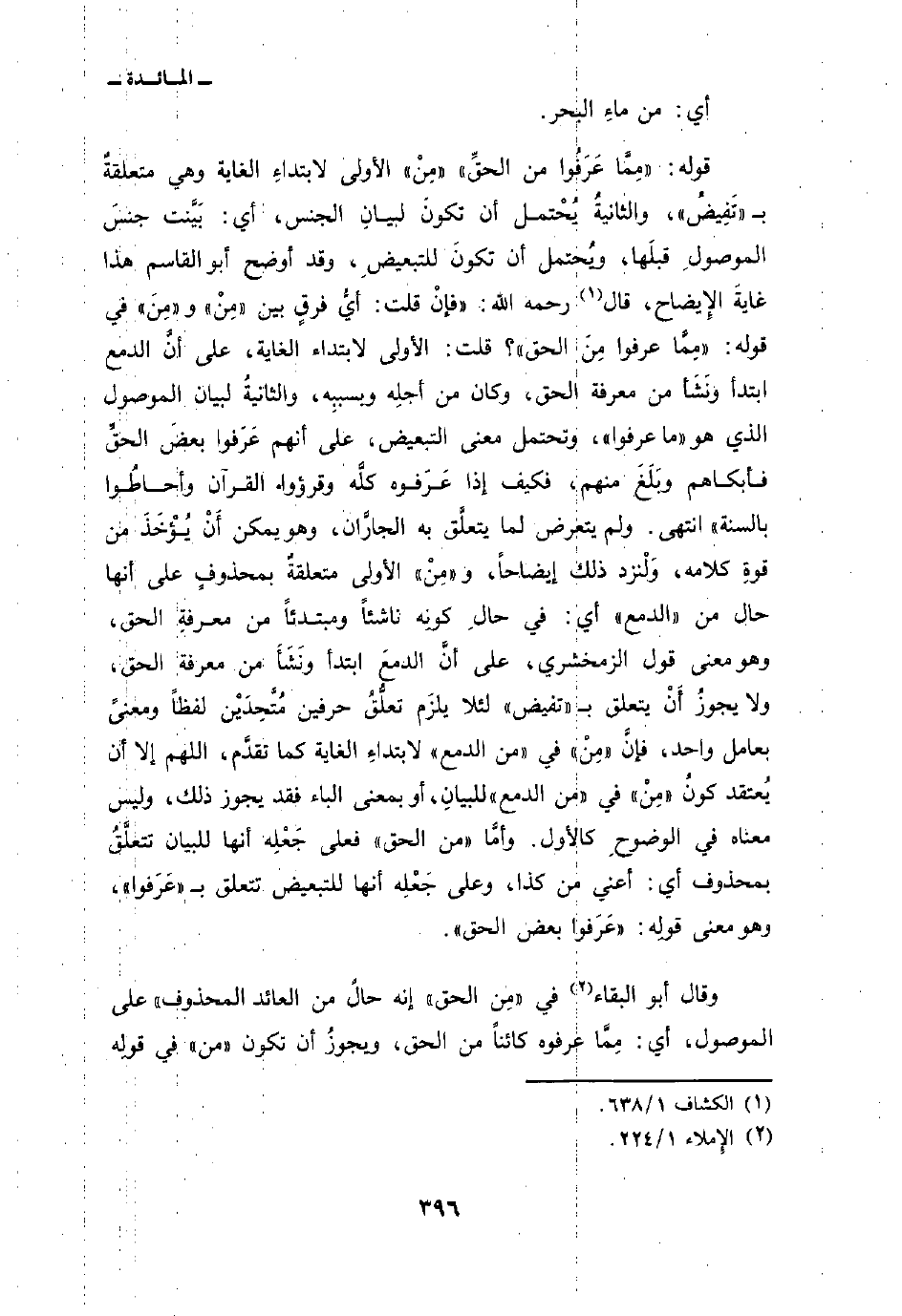 قوله: {مِمَّا عَرَفُواْ مِنَ الحق} «مِنْ» الأولى لابتداءِ الغاية وهي متعلقةٌ ب «تَفِيضُ» والثانيةُ يُحْتمل أن تكونَ لبيانِ الجنس، أي: بَيَّنت جنسَ الموصولِ قبلَها، ويُحتمل أن تكونَ للتبعيضِ، وقد أوضح أبو القاسم هذا غايةَ الإِيضاح، قال رحمه الله: «فإنْ قلت: أيُّ فرقٍ بينَ» مِنْ «و» مِنَ «في قوله: {مِمَّا عَرَفُواْ مِنَ الحق} ؟ قلت: الأولى لابتداء الغاية، على أنَّ الدمع ابتدأ ونَشَأ من معرفة الحق، وكان من أجله وبسببِه، والثانيةُ لبيان الموصول الذي هو» ما عرفوا «وتحتمل معنى التبعيض، على أنهم عَرَفوا بعضَ الحقِّ فأبكاهم وبَلَغَ منهم، فكيف إذا عَرَفوه كلَّه وقرؤوا القرآن وأحاطُوا بالسنة» انتهى. ولم يتعرض لما يتعلَّق به الجارَّان وهو يمكن أَنْ يُؤْخَذَ من قوةِ كلامه، وَلْنزد ذلك إيضاحاً و «مِنْ» الأولى متعلقةٌ بمحذوفٍ على أنها حال من «الدمع» أي: في حالِ كونه ناشئاً ومبتدئاً من معرفةِ الحق، وهو معنى قول الزمخشري، على أنَ الدمعَ ابتدأ ونشَأَ من معرفة الحق، ولا يجوزُ أَنْ يتعلق ب «تفيض» لئلا يلزَم تعلُّقُ حرفين مُتَّحِدَيْن، لفظاً ومعنىً بعامل واحد، فإنَّ «مِنْ» في «من الدمع» لابتداءِ الغاية كما تقدَّم، اللهم إلا أن يُعتقد كونُ «مِنْ» في «من الدمع» للبيانِ، أو بمعنى الباء فقد يجوز ذلك، وليس معناه في الوضوحِ كالأول.
