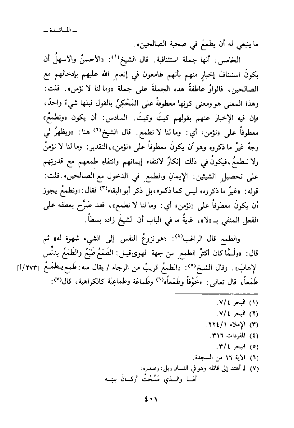 السادس: أن يكون «ونطمعُ» معطوفاً على «نؤمن» أي: وما لنا لا نطمع. قال الشيخ هنا: «ويظرُ لي وجهُ غيرُ ما ذكروه وهو أن يكونَ معطوفاً على» نؤمن «التقدير: وما لنا لا نؤمنُ ولا نطمعُ، فيكونُ في ذلك إنكارٌ لانتفاء إيمانهم وانتفاءِ طمعهم مع قدرتِهم على تحصيلِ الشيئين: الإِيمانِ والطمعِ في الدخول مع الصالحين» قلت: قوله: «غيرُ ما ذكروه» ليس كما ذكره، بل ذكر أبو البقاء فقال: «ونطمعُ يجوز أن يكونَ معطوفاً على» نؤمن «أي: وما لنا لا نطمع» ، فقد صَرَّح بعطفه على الفعل المنفي ب «لا» غايةُ ما في الباب أن الشيخَ زاده بسطاً.