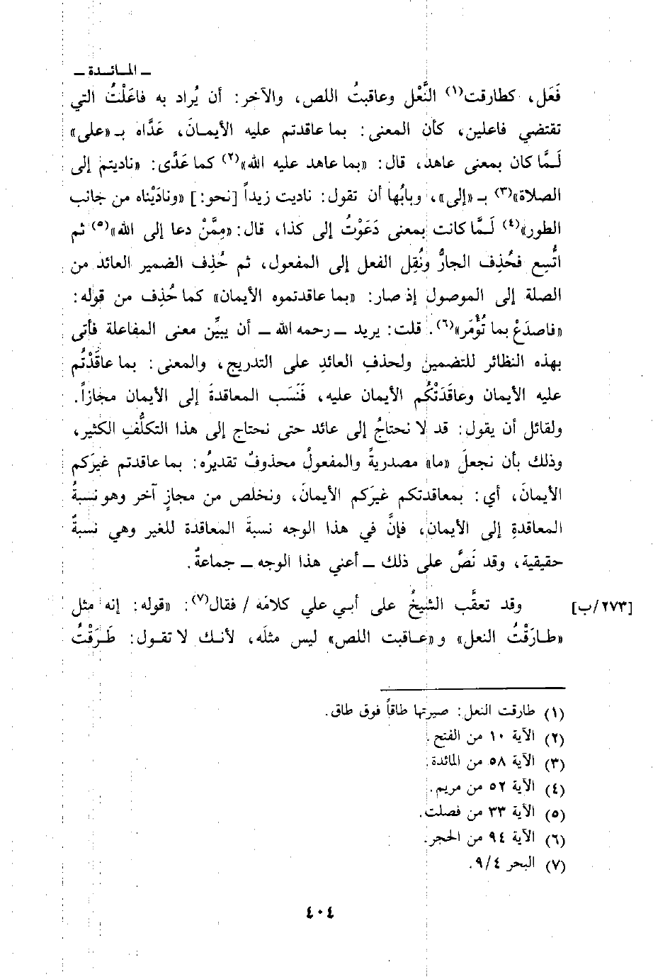 فَعَل، كطارقت النَّعْل وعاقبتُ اللص، والآخر: أن يُراد به فاعَلْتُ التي تقتضي فاعلين، كأن المعنى: بما عاقدتم عليه الأيمانَ، عَدَّاه ب «على» لَمَّا كان بمعنى عاهد، قال: {بِمَا عَاهَدَ عَلَيْهِ الله} [الفتح: 10] كما عَدَّى: {نَادَيْتُمْ إِلَى الصلاة} [المائدة: 58] ب «إلى» وبابُها أن تقول: ناديت زيداً [نحو:] {وَنَادَيْنَاهُ مِن جَانِبِ الطور} [مريم: 52] لَمَّا كانت بمعنى دَعَوْتُ إلى كذا، قال: {مِّمَّن دَعَآ إِلَى الله} [فصلت: 33] ثم اتُّسِع فحُذِف الجارُّ ونُقِل الفعل إلى المفعول، ثم حُذِف الضمير العائد من الصلة إلى الموصول إذ صار: {بِمَا عَقَّدتُّمُ الأيمان} كما حُذِف من قوله: {فاصدع بِمَا تُؤْمَرُ} [الحجر: 94] قلت: يريد - رحمه الله - أن يبيِّن معنى المفاعلة فأتى بهذه النظائر للتضمين ولحذفِ العائدِ على التدريج، والمعنى: بما عاقَدْتُم عليه الأيمان وعاقَدَتُم الأيمان عليه، فَنَسَب المعاقدةَ إلى الأيمان مجازاً. ولقائل أن يقول: قد لانحتاجُ إلى عائد حتى نحتاج إلى هذا التكلُّفِ الكثير، وذلك بأن نجعلَ «ما» مصدريةً والمفعولُ محذوفٌ تقديرُه: بما عاقدتم غيرَكم الأيمانَ، أي: بمعاقدتكم غيرَكم الأيمانَ، ونخلص من مجازٍ آخر وهو نسبةُ المعاقدةِ إلى الأيمان، فإنَّ في هذا الوجه نسبةَ المعاقدة للغير وهي نسبةٌ حقيقة، وقد نَصَّ على ذلك - أعني هذا الوجه - جماعةٌ.