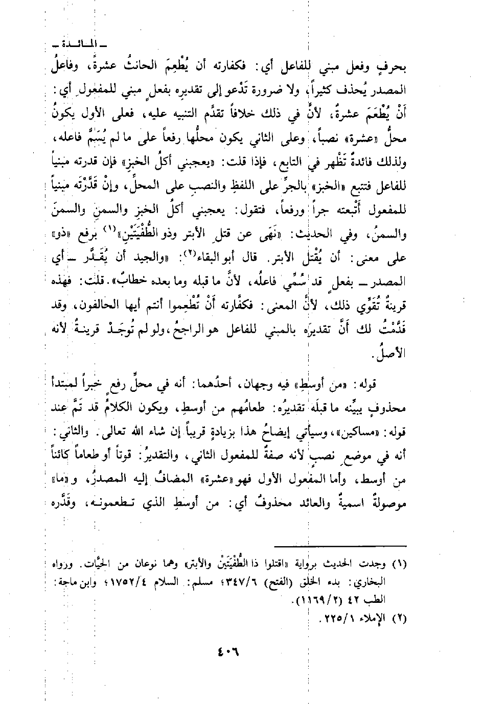 بحرفٍ وفعل مبني للفاعل أي: فكفارته أن يُطْعِمَ الحانثُ عشرةً، وفاعلُ المصدر يُحذف كثيراً، ولا ضرورة تَدْعوا إلى تقديرِه بفعلٍ مبني للمفعولِ أي: أن يُطْعَمَ عشرةٌ، لأنَّ في ذلك خلافاً تقدَّم التنبيه عليه، فعلى الأول يكونُ محلُّ «عشرة» نصباً، وعلى الثاني يكون محلُّها رفعاً على ما لم يُسَمِّ فاعله، ولذلك فائدةٌ تَظْهر في التابع، فإذا قلت: «يعجبني أكلُ الخبزِ» فإن قدرته مبنياً للفاعل فتتبع «الخبز» بالجرِّ على اللفظِ والنصبِ على المحلِّ، وإنْ قَدًّرْتَه مبنياً للمفعول أَتْبعته جراً ورفعاً، فتقول، يعجبني أكلُ الخبزِ والسمنِ والسمنَ والسمنُ، وفي الحديث: «نَهَى عن قتلِ الأبتر وذو الطُّفْيَتَيْنِ» برفع «ذو» على معنى: أن يُقْتل الأبتر. قال أبو البقاء «والجيد أن يُقَدِّر- أي المصدر - بفعلٍ قد سُمِّي فاعلُه، لأنَّ ما قبله وما بعده خطابٌ» قلت: فهذه قرينةٌ تُقَوِّي ذلك، لأنَّ المعنى: فكفَّارته أَنْ تُطْعِموا أنتم أيها الحالفون، وقد قَدَّمْتُ لك أَنَّ تقديرَه بالمبني للفاعل هو الراجحُ، ولو لم تُوجَدْ قرينةٌٌ لأنه الأصلُ.