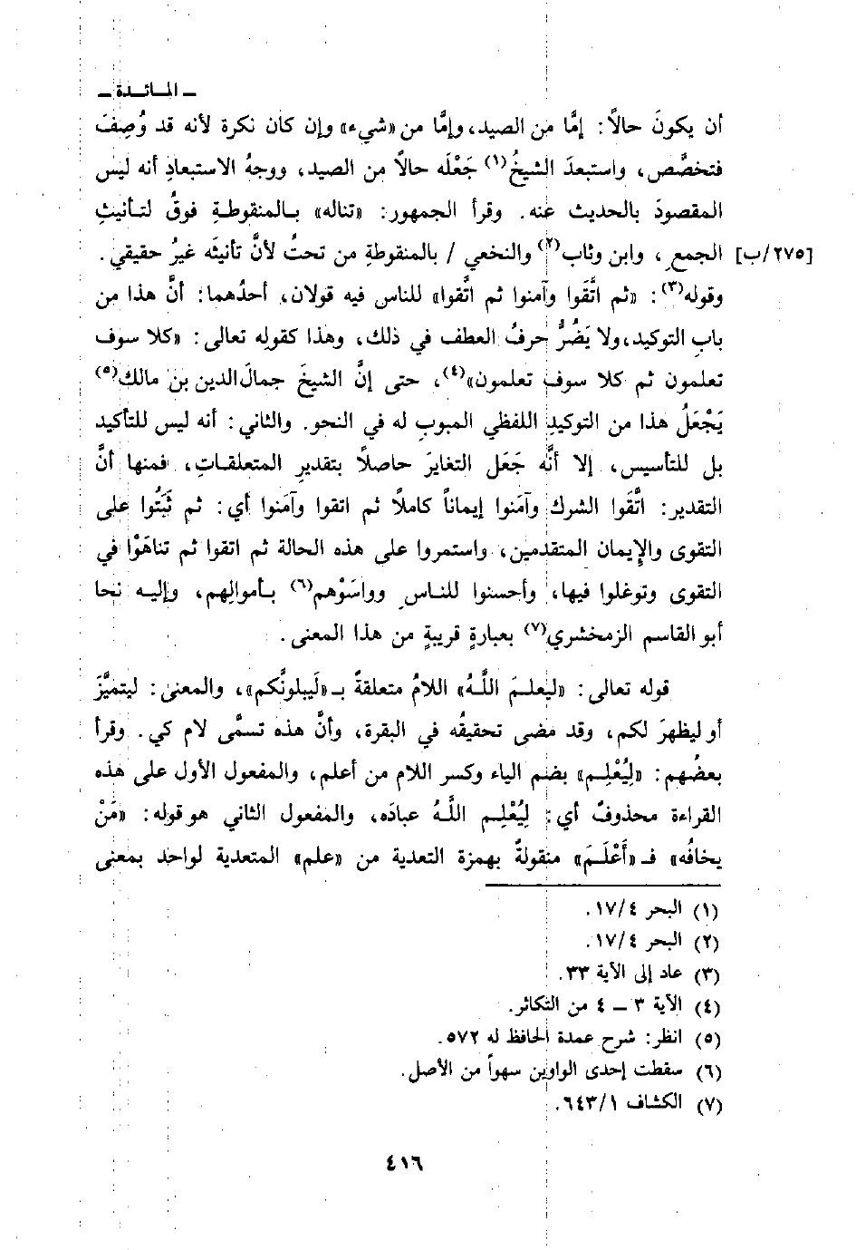 أن يكونَ حالاً: إمَّا من الصيد، وإمَّا من «شيء» وإن كان نكرة لأنه قد وُصِفَ فتخصَّص، واستبعدَ الشيخُ جَعْلَه حالاً من الصيد، ووجهُ الاستبعادِ أنه ليس المقصودَ بالحديث عنه. وقرأ الجمهور: {تناله} بالمنقوطةِ فوقُ لتأنيثِ الجمعِ، وابن وثاب والنخعي / بالمنقوطةِ من تحتُ لأنَّ تأنيثَه غيرُ حقيقي. وقوله: {ثُمَّ اتَّقَواْ وَآمَنُواْ ثُمَّ اتَّقَواْ} [المائدة: 93] للناس فيه قولان، أحدُهما: أنَّ هذا من بابِ التوكيد، ولا يَضُرُّ حرفُ العطف في ذلك، وهذا كقولِه تعالى: {كَلاَّ سَوْفَ تَعْلَمُونَ ثُمَّ كَلاَّ سَوْفَ تَعْلَمُونَ} [التكاثر: 34] ، حتى إنَّ الشيخَ جمالَ الدين بن مالك يَجْعَلُ هذا من التوكيدِ اللفظي المبوبِ له في النحو: والثاني: أنه ليس للتأكيد بل للتأسيس، إلا أنَّه جَعَل التغايرَ حاصلاً بتقديرِ المتعلقاتِ، فمنها أنَّ التقدير: اتَّقَوا الشرك وآمَنوا إيماناً كاملاً ثم اقتوا وآمَنوا أي: ثم ثَبَتُوا على التقوى والإِيمان المتقدمين، واستمروا على هذه الحال ثم اتقوا ثم تناهَوْا في التقوى وتوغلوا فيها، وأحسنوا للناسِ وواسَوْهم بأموالِهم، وإليه نحا أبو القاسم الزمخشري بعبارةٍ قريبةٍ من هذا المعنى.