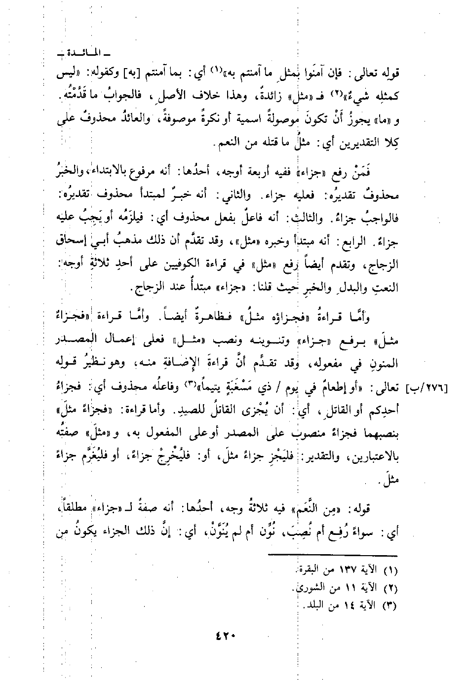 قوله تعالى: {فَإِنْ آمَنُواْ بِمِثْلِ مَآ آمَنْتُمْ بِهِ} [البقرة: 137] أي: بما آمنتم [به] وكقوله: {لَيْسَ كَمِثْلِهِ شَيْءٌ} [الشورى: 11] ف «مثل» زائدةٌ، وهذا خلاف الأصلِ، فالجوابُ ما قَدَّمْتُه. و «ما» يجوزُ أْن تكونَ موصولةً اسمية أو نكرةً موصوفةً، والعائدُ محذوفٌ على كِلا التقديرين أي: مثلُ ما قتله من النعم.