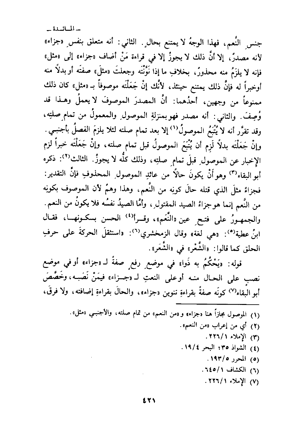 جنسِ النَّعم، فهذا الوجهُ لا يمتنع بحالٍ. الثاني: أنه متعلق بنفسِ «جزاء» لأنه مصدرٌ، إلا أنَّ ذلك لا يجوزُ إلا في قراءة مَنْ أضاف «جزاء» إلى «مثل» فإنه لا يلزَمُ منه محذورٌ، بخلافِ ما إذا نَوَّنْتَه وجعلتَ «مثلَ» صفتَه أو بدلاً منه أو خبراً له فإنَّ ذلك يمتنع حينئذ، لأنَّك إنْ جَعَلْتَه موصوفاً ب «مثل» كان ذلك ممنوعاً من وجهين، أحدُهما: أنَّ المصدرَ الموصوفَ لا يعملُ وهذا قد وُصِفَ. الثاني: أنه مصدر فهو بمنزلةِ الموصولِ والمعمولُ من تمامِ صلتِه، وقد تقرَّر أنه لا يُتْبَعُ الموصولُ إلا بعد تمام صلته لئلا يلزمَ الفصلُ بأجنبي. وإنْ جَعَلْتَه بدلاً لَزِم أن يُتْبَعَ الموصولُ قبل تمام صلته، وإنْ جَعَلْتَه خبراً لزم الإِخبار عن الموصولِ قبلَ تمامِ صلتِه، وذلك كلُّه لا يجوزُ. الثالث: ذكره أبو البقاء وهو أَنْ يكونَ حالاً من عائدِ الموصولِ المحذوفِ فإنَّ التقدير: فجزاءً مثلَ الذي قتله حالَ كونه من النَّعم، وهذا وهمٌ لأنه الموصوف بكونِه من النَّعم إنما هو جزاءُ الصيد المقتولِ، وأمَّا الصيدُ نفسُه فلا يكونُ من النعم، والجمهورُ على فتحِ عين «النَّعَم» ، وقرأ الحسن بسكونها، فقال ابنُ عطية: {هي لغة} وقال الزمخشري: «استثقلَ الحركةَ على حرفِ الحلق كما قالوا:» الشَّعْر «في» الشَّعَر «.