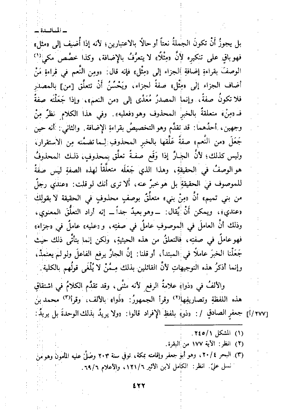 والثاني: أنه حين جَعَلَ «من النَّعم» صفةً عَلَّقها بالخبرِ المحذوفِ لِما تضمَّنه مِن الاستقرار، وليس كذلك؛ لأنَّ الجارَّ إذا وَقَع صفةً تعلَّق بمحذوفٍ، ذلك المحذوفُ هو الوصفُ في الحقيقةِ، وهذا الذي جَعَلَه متعلِّقاً لهذه الصفةِ ليس صفةً للموصوف في الحقيقةِ بل هو خبرٌ عنه، ألا ترى أنك لو قلت: «عندي رجلٌ من بني تميم» أنَّ «مِنْ بين» متعلِّقٌ بوصفٍ محذوفٍ في الحقيقة لا بقولِك «عندي» ويمكن أَنْ يقال: - وهو بعيدٌ جداً - إنه أراد التعلُّقَ المعنوي، وذلك أنَّ العاملَ في الموصوفِ عاملٌ في صفتِه، و «عليه» عاملٌ في «جزاء» فهو عاملٌ في صفتِه، فالتعلقُ من هذه الحيثيةِ، ولكن إنما يتأتَّى ذلك حيث جَعَلْنا الخبرَ عاملاً في المبتدأ، أو قلنا: إنَّ الجارَّ يرفع الفاعلَ ولو لم يعتمدْ، وإنما أذكرُ هذه التوجيهاتِ لأنَّ القائلين بذلك مِمَّنْ لا يُلْغَى قولُهم بالكلية.