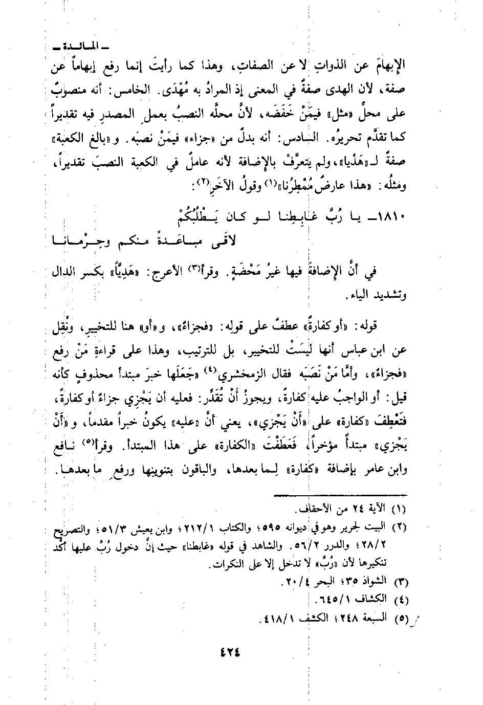الإِبهامَ عن الذوات لا عن الصفاتِ، وهذا كما رايتَ إنما رفع إبهاماً عن صفة، لأن الهدى صفةٌ في المعنى إذ المرادُ به مُهْدَى. الخامس: أنه منصوبٌ على محلِّ» مثل «فيمَنْ خَفَضَه، لأنَّ محلَّه النصبُ بعملِ المصدرِ فيه تقديراً كما تقدَّم تحريرُه. السادس: أنه بدلٌ من» جزاء «فيمَنْ نصبَه. و» بالغ الكعبة «صفةٌ ل» هَدْيا «ولم يتعرَّفْ بالإِضافة لأنه عاملٌ في الكعبة النصبَ تقديراً، ومثلُه، {هذا عَارِضٌ مُّمْطِرُنَا} [الأحقاف: 24] وقولُ الآخرِ: