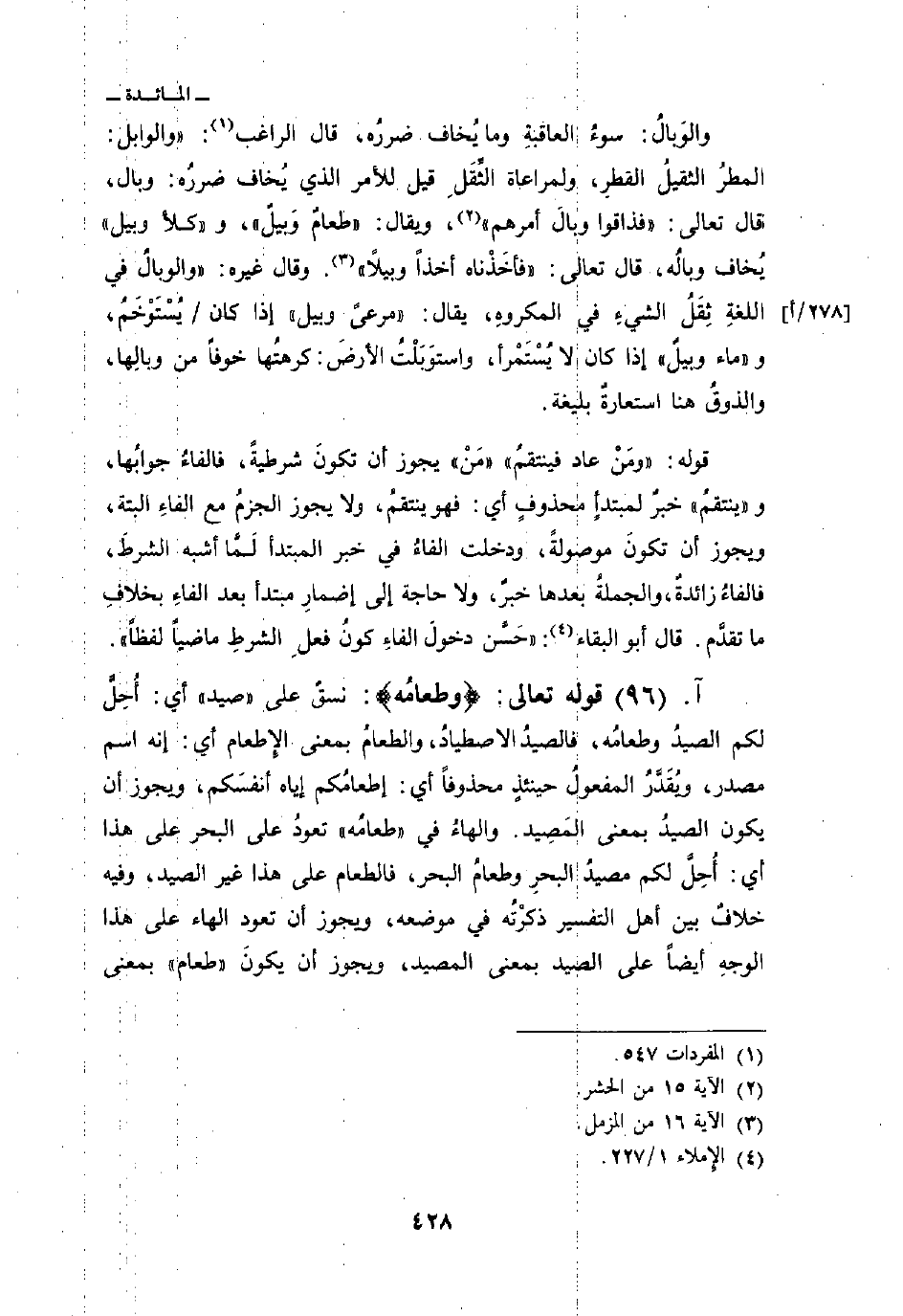 قوله تعالى: {وَطَعَامُهُ} : نسقٌ على «صيد» أي: أُحِلَّ لكم الصيدُ وطعامهُ، فالصيدُ الاصطيادُ، والطعامُ الإِطعام أي: إنه اسم مصدر، ويُقَّدَّرُ المفعولُ حينئذٍ محذوفاً أي: إطعامُكم إياه أنفسَكم، ويجوز أن يكون الصيدُ بمعنى المَصِيد. والهاءُ في «طعامُه» تعودُ على البحر على هذا أي: أُحِلَّ لكم مصيدُ البحر وطعامُ البحر، فالطعام على هذا غير الصيد، وفيه خلافٌ بين أهل التفسير ذكرْتُه في موضعه، ويجوز أن تعود الهاء على هذا الوجهِ أيضاً على الصيد بمعنى المصيد، ويجوز أن يكونَ «طعام» بمعنى