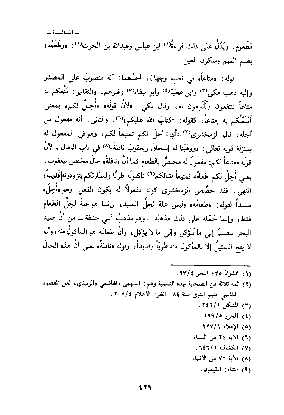 قوله: {مَتَاعاً} في نصبِه وجهان، أحدُهما: أنه منصوبٌ على المصدر وإليه ذهب مكي وابن عطيَة وأبو البقاء وغيرهم، والتقدير: مَتَّعكم به متاعاً تنتفعون وتَأْتَدِمون به، وقال مكي: «لأنَّ قولَه» «أُحِلَّ لكم» بمعنى أَمْتَعْتُكم به إمتاعاً، كقوله: {كِتَابَ الله عَلَيْكُمْ} [النساء: 24] . والثاني: أنه مفعول من أجله، قال الزمشخري: «أي: أحلَّ لكم تمتيعاً لكم، وهو في المفعول له بمنزلة قولِه تعالى: {وَوَهَبْنَا لَهُ إِسْحَاقَ وَيَعْقُوبَ نَافِلَةً} [الأنبياء: 72] في باب الحالِ، لأنَّ قوله {مَتَاعاً لَّكُمْ} مفعولٌ له مختصٌّ بالطعام كما أنَّ» نافلةً «حالٌ مختص بيعقوب، يعني أُحِلَّ لكم طعامُه تمتيعاً لتنائكم تأكلونَه طريَّا ولسيَّارتكم يتزودونه قَديداً» انتهى. فقد خصَّص الزمخشري كونه مفعولاً له بكون الفعلِ وهو «أُحِلَّ مسنداً لقوله: {وَطَعَامُهُ} وليس علة لحِلِّ الصيد، وإنما علةٌ لحِلِّ الطعام فقط، وإنما حَمَلَه على ذلك مذهبُه - وهو مذهبُ أبي حنيفة - من أنَّ صيدَ البحرِ منقسمٌ إٍلى ما يُؤْكل وإلى ما لا يؤكل، وأنَّ طعامَه هو المأكولُ منه، وأنه لا يقع التمثيلُ إلا المأكول منه طريّاً وقديداً، وقوله» نافلةً «يعني أنَّ هذه الحالَ