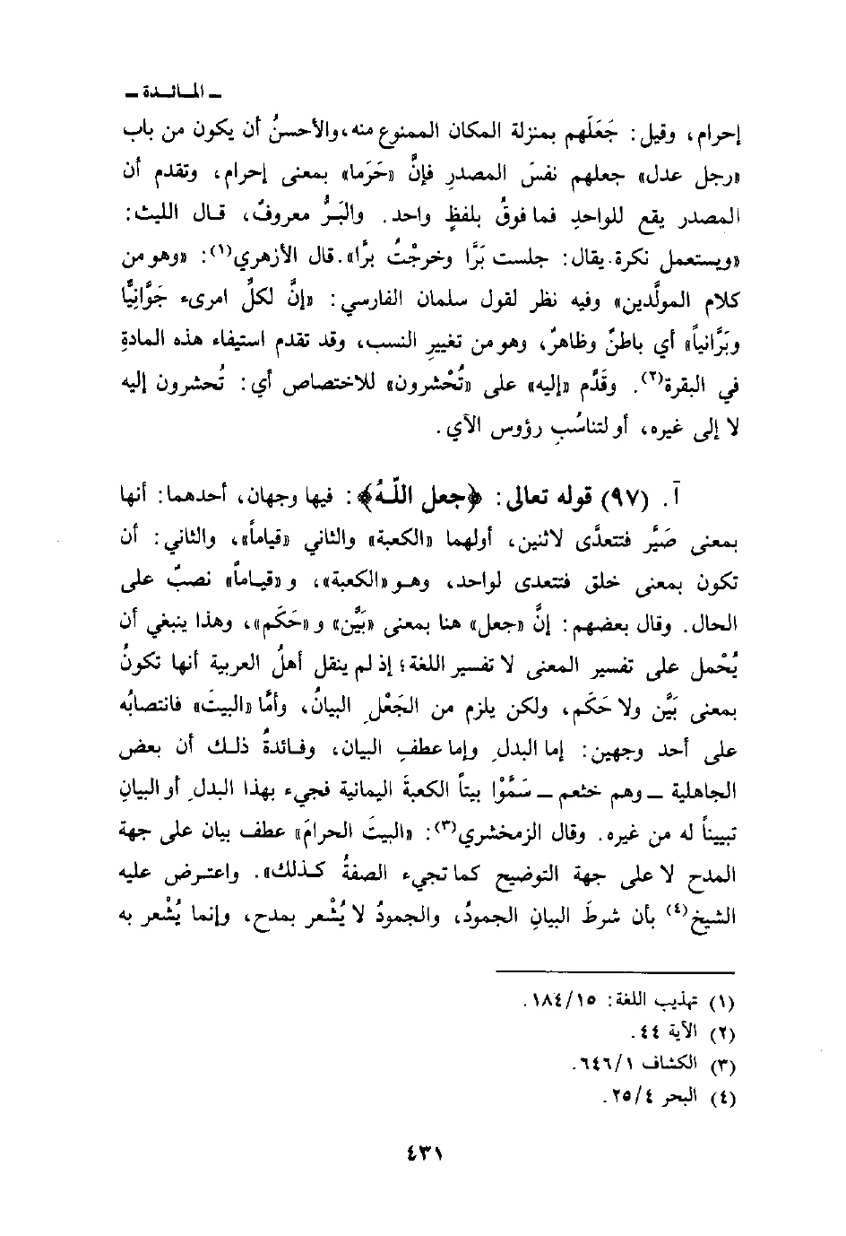 قوله تعالى: {جَعَلَ الله} : فيها وجهان، أحدهما: أنها بمعنى صَيَّر فتتعدَّى لاثنين، أولهما «الكعبة» والثاني «قياماً» والثاني: أن تكون بمعنى خلق فتتعدى لواحد، وهو «الكعبة» و «قياماً» نصبٌ على الحال. وقال بعضهم: إنَّ «جعل» هنا بمعنى «بَيَّن» و «حَكَم» ، وهذا ينبغي أن يُحْمل على تفسير المعنى لا تفسير اللغة؛ إذ لم ينقل أهلُ العربية أنها تكونُ بمعنى بَيَّن ولا حَكَم، ولكن يلزم من الجَعْلِ البيانُ، وأمَّا «البيتَ» فانتصابُه على أحد وجهين: إما البدلِ وإما عطفِ البيان، وفائدةُ ذلك أن بعض الجاهلية - وهم خثعم- سَمَّوْا بيتاً الكعبةَ اليمانية فجيء بهذا البدلِ أو البيانِ تبييناً له من غيره. وقال الزمخشري: «البيتَ الحرامَ» عطف بيان على جهة المدح لا على جهة التوضيح كما تجيء الصفةُ كذلك «واعترض عليه الشيخ بأن شرطَ البيانِ الجمودُ، والجمودُ لا يُشْعر بمدح، وإنما يُشْعر به