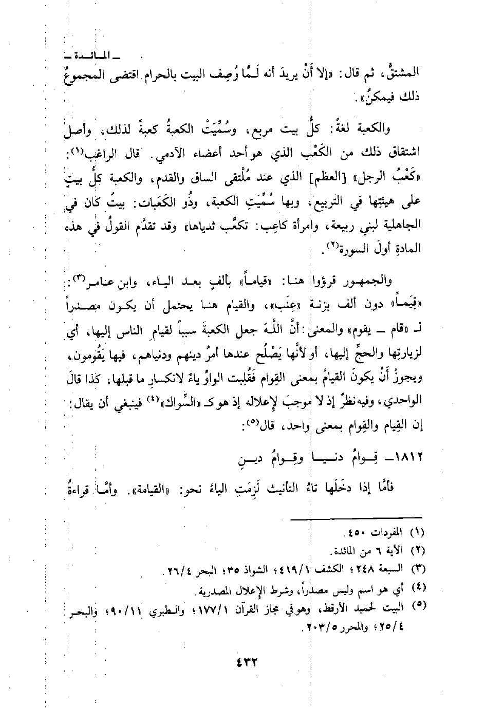 والجمهور قرؤوا هنا: «قياماً» بألفٍ بعد الياء، وابن عامر: «قِيَماً» دون ألف بزنة «عِنَب» ، والقيام هنا يحتمل أن يكون مصدراً ل «قام - يقوم» والمعنى: أنَّ اللَّهَ جعل الكعبةَ سبباً لقيامِ الناس إليها، أي: لزيارتِها والحجِّ إليها، أو لأنَّها يَصْلُح عندها أمرُ دينهم ودنياهم، فيها يَقُومون، ويجوزُ أَنْ يكونَ القيامُ بمعنى القِوام فَقُلبت الواوُ ياءً لانكسارِ ما قبلها، كذا قالَ الواحدي، وفيه نظرٌ إذ لا موجبَ لإِعلاله إذ هو ك «السِّواك» فينبغي أن يقال: إن القِيام والقِوام بمعنى واحد، قال: