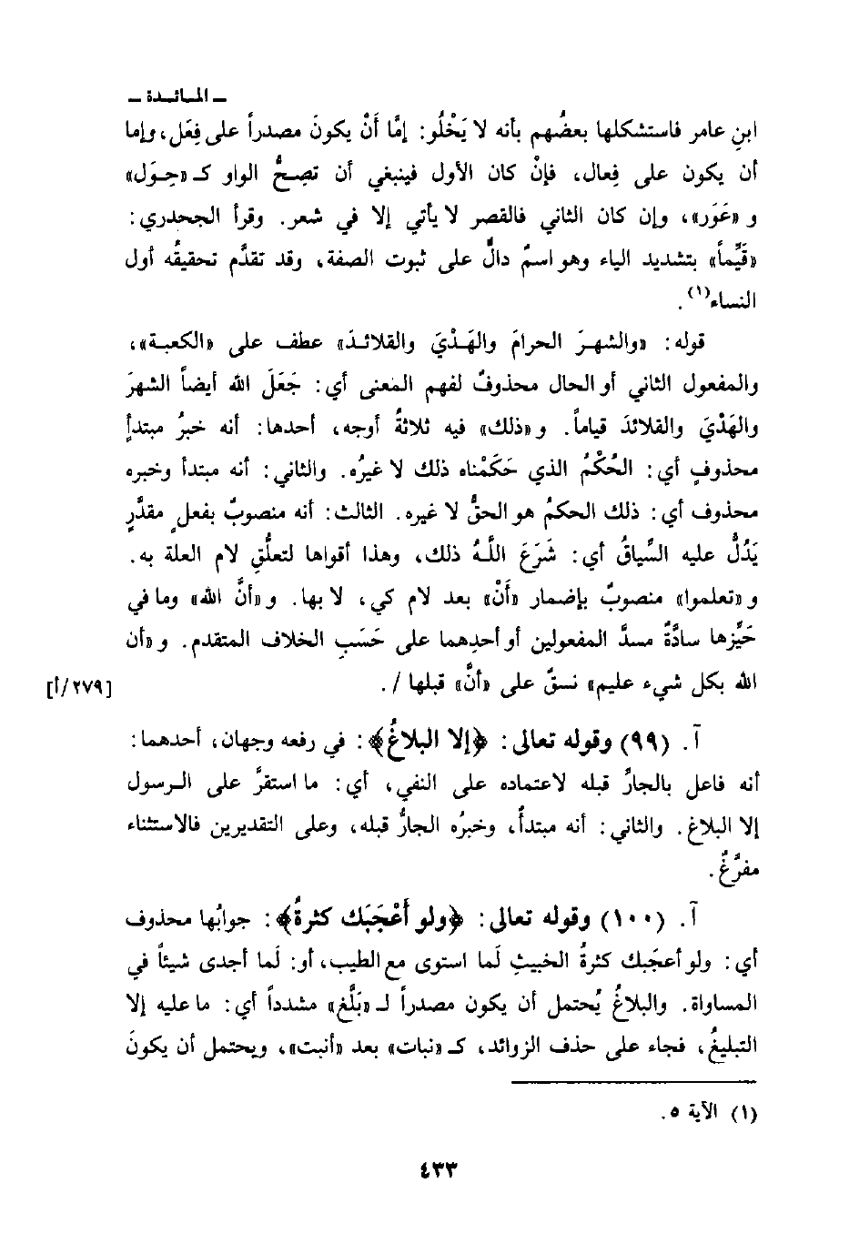 وقوله تعالى: {وَلَوْ أَعْجَبَكَ كَثْرَةُ} : جوابُها محذوف أي: ولو أُعجَبك كثرة الخبيثِ لَما استوى مع الطيب، أو: لَما أجدى شيئاً في المساواة. والبلاغُ يُحتمل أن يكون مصدراً ل «بَلَّغ» مشدداً أي: ما عليه إلا التبليغُ، فجاء على حذف الزوائد، ك «نبات» بعد «أنبت» ويحتمل أن يكونَ