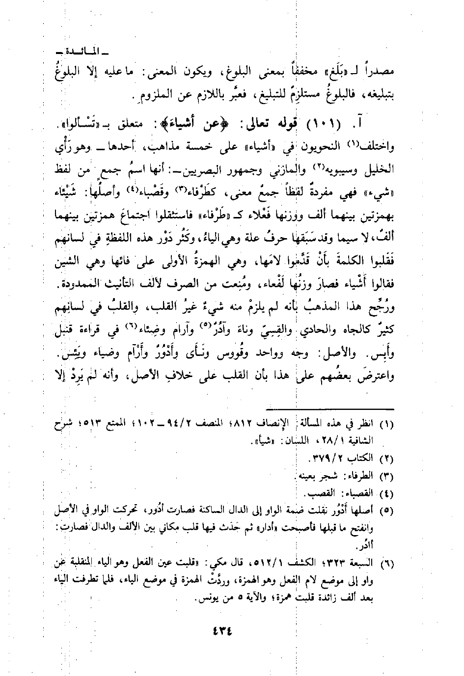 قوله تعالى: {عَنْ أَشْيَآءَ} : متعلق ب «تَسْألوا» واختلف النحويون في «اشياء» على خمسة مذاهب، أحدها - وهو رَأْي الخليل وسيبويه والمازني وجمهور البصريين -: أنها اسمُ جمعٍ من لفظ «شيء» فيه مفردةٌ لفظاً جمعٌ معنى، كطَرْفاء وقَصْباء وأصلُها: شَيْئاء بهمزتين بينهما ألف ووزنها فَعْلاء ك «طَرْفاء» فاستثقلوا اجتماعَ همزتين بينهما ألفٌ، لا سيما وقد سَبَقها حرفُ علة وهي الياءُ، وكَثُر دَوْر هذه اللفظةِ في لسانهم فَقَلبوا الكلمةَ بأَنْ قَدَّموا لامَها، وهي الهمزةُ الأولى على فائها وهي الشين فقالوا أَشْياء فصارَ وزنُها لَفْعاء، ومُنِعت من الصرف لألف التأنيث الممدودة. ورُجِّح هذا المذهبُ بأنه لم يلزْم منه شيءٌ غيرُ القلب، والقلبُ في لسانِهم كثيرٌ كالجاه والحادي والقِسِيّ وناءَ وآدُرٌ وآرام وضِئاء في قراءة قنبل وأَيِس. والأصل: وجه وواحد وقُووس ونَأَى وأَدْوُرُ وأَرْآم وضياء ويَئِس. واعترضَ بعضُهم على هذا بأن القلب على خلافِ الأصل، وأنه لم يَرِدْ إلا