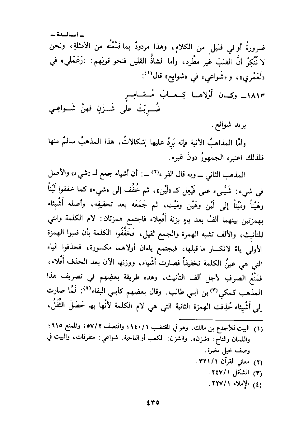 المذهب الثاني - وبه قال الفراء -: أن أشياء جمع ل «شيء» والأصل في شيء: شَيِّئ على فَيْعِل ك «لَيِّن» ثم خُفِّف إلى «شيء» ما خففوا لَيّناً وهَيّناً ومَيّتاً إلى لَيْن وهَيْن ومَيْت، ثم جَمَعَه بعد تخفيفِه، وأصله أَشْيِئاء بهمزتين بينهما ألف بعد ياءٍ بزنة أَفْعِلاء فاجتمع همزتان: لام الكلمة والتي للتأنيث، والألف تشبه الهمزة والجمع ثقيل: فَخَفَّفُوا الكلمة بأن قلبوا الهمزة الأولى ياءً لانكسار ما قبلها، فيجتمع ياءان أولاهما مكسورة، فحذفوا الياء التي هي عينُ الكلمة تخفيفاً فصارت أَشْياء، ووزنها الآن بعد الخلاف أَفْلاء، فمَنْعُ الصرفِ لأجل ألف التأنيث، وهذه طريقة بعضِهم في تصريف هذا المذهب كمكي بن أبي طالب. وقال بعضهم كأبي البقاء: لَمَّا صارت إلى أَشْيئاء حُذِفت الهمزة الثانية التي هي لام الكلمة لأنَّها بها حَصَلَ الثِّقَلُ،