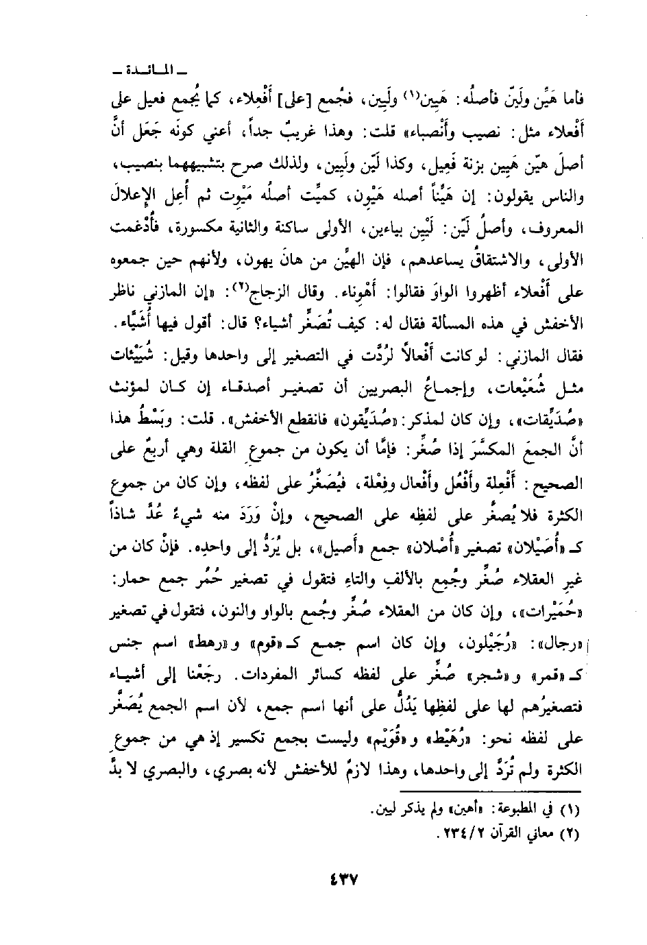فأما هَيِّن ولَين فأصلُه: هَيين ولَيين، فجُمع [على] أَفْعِلاء، كما يُجمع فعيل على أَفعْلاء مثل: نصيب وأَنْصباء» قلت: وهذا غريبٌ جداً، أعني كونَه جَعَل أنَّ أصلَ هيّن هَيين بزنةَ فَعِيل، وكذا لَيّن ولَيِين، ولذلك صرح بتشبيههما بنصيب، والناس يقولون: إن هَيِّناً أصله هَيْوِن، كميِت أصلُه مَيْوِت ثم أُعِل الإِعلالَ المعروف، وأصلُ لَيّن: لَيْيين بياءين، الأولى ساكنة والثاينة مكسورة، فأُدْغمت الأولى، والاشتقاقُ يساعدهم، فإن الهيِّن من هانَ يهون، ولأنهم حين جمعوه على أَفْعلاء أظهروا الواوَ فقالوا: أَهْوِناء. وقال الزجاج: «إن المازني ناظر الأخفش في هذه المسألة فقال له: كيف تُصَغَّر اشياء؟ قال: أقول فيها أُشَيَّاء. فقال المازني: لو كانت أَفْعالاً لرُدَّت في التصغير إلى واحدها وقيل: شُيَئْات مثل شُعَيْعات، وإجماعُ البصريين أن تصغير أصدقاء إن كان لمؤنث» صُدّيَّقات «، وإن كان لمذكر:» صُدَيِّقون «فانقطع الأخفش» . قلت: وبَسْطُ هذا أنَّ الجمعَ المكسَّرَ إذا صُغِّر: فإمَّا أن يكون من جموعِ القلة وهي أربعٌ على الصحيح: أَفْعِلة وأَفْعُل وأَفْعال وفِعْلة، فيُصَغَّرُ على لفظة، وإن كان من جموع الكثرة فلا يُصغَّر على لفظِه على الصحيح، وإنْ وَرَدَ منه شيءٌ عُدَّ شاذاً ك «أُصَيْلان» تصغير «أُصْلان» جمع «أَصيل» بل يُرَدُّ إلى واحدِه. فإنْ كان من غير العقلاء صُغِّر وجُمِع بالألفِ والتاءِ فتقول في تصغير حُمُر جمع حمار: «حُمَيْرات» ، وإن كان من العقلاء صُغِّر وجُمع بالواو والنون، فتقول في تصغير «رجال» : «رُجَيْلون، وإن كان اسم جمع ك» قوم «و» رهط «اسم جنس ك» قمر «و» شجر «صُغِّر على لفظه كسائر المفردات.