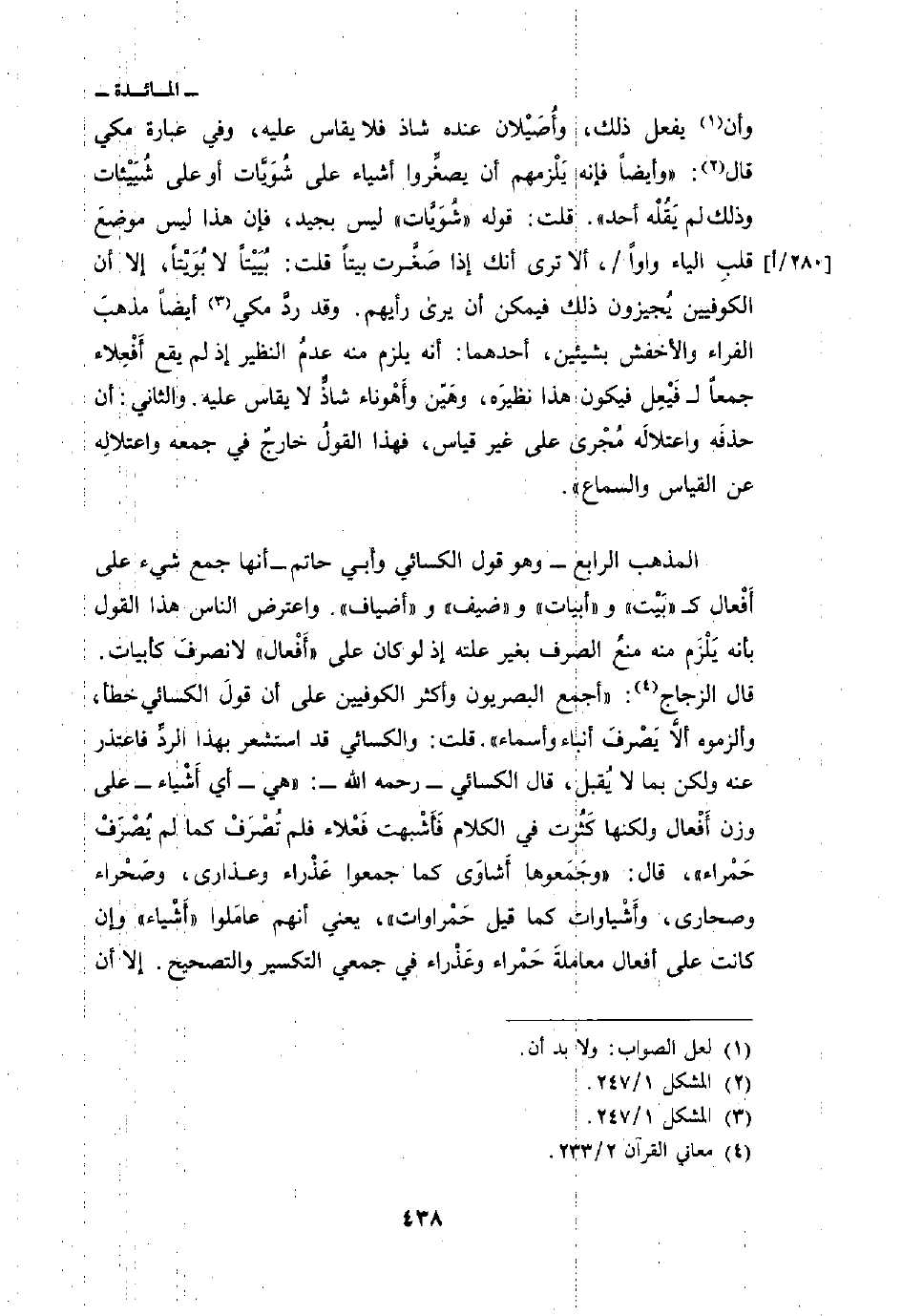 المذهب الرابع - وهو قول الكسائي وأبي خاتم - أنها جمع شيء على أَفْعال ك» بَيْت «و» أبيات «و» ضيف «و» أضياف «واعترض الناس هذا القول بأنه يَلْزَم منه منعُ الصرف بغير علته إذ لو كان على» أَفْعال «لا نصرفَ كأبيات. قال الزجاج:» أجمع البصريون وأكثر الكوفيين على أن قولَ الكسائي خطأ، وألزموه ألاَّ يَصْرف أنباء وأسماء «قلت: والكسائي قد استشعر بهذا الردِّ فاعتذر عنه ولكن بما لا يُقبل، قال الكسائي - رحمه الله-:» هي - أي أَشْياء - على وزن أَفْعال ولكنها كَثُرت في الكلام فَأَشْبهت فَعْلاء فلم تُصْرَفْ كما لم يُصْرَفْ حَمْراء «قال:» وجَمَعوها أَشاوَى كما جمعوا عَذْراء وعذارى، وصَحْراء وصحارى، وأَشْياوات كما قيل حَمْراوات «، يعني أنهم عامَلوا» أَشْياء «وإن كانت على أفعال معاملةَ حَمْراء وعَذْراء في جمعي التكسير والتصحيح. إلا أن
