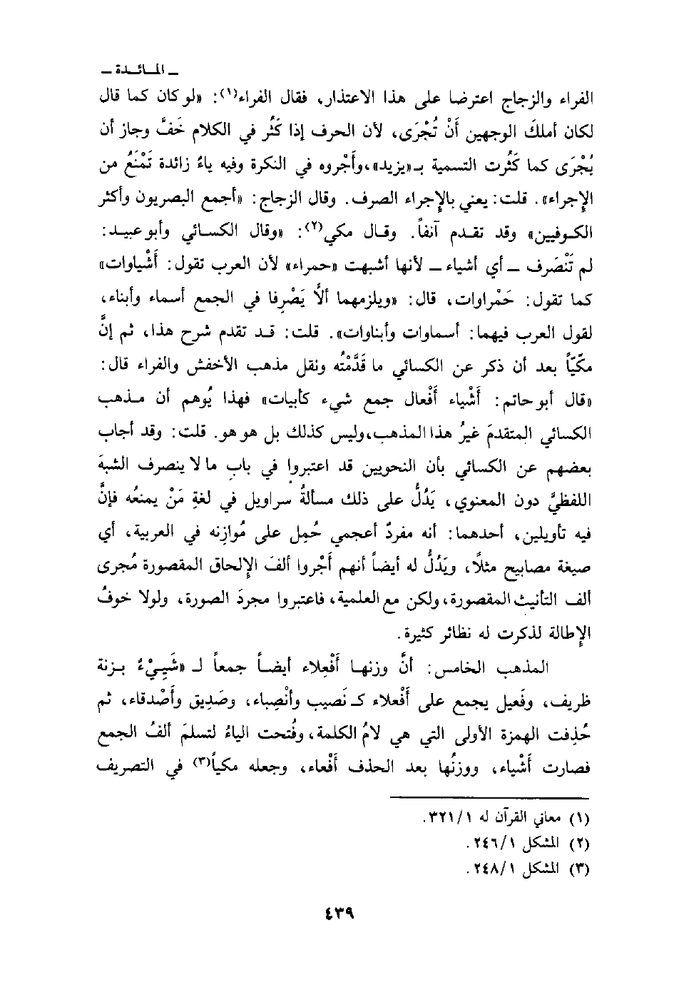 الفراء والزجاج اعترضا على هذا الاعتذار، فقال الفراء:» لو كان كما قال لكان أملكَ الوجهين أَنْ تُجْرَى، لأن الحرف إذا كَثُر في الكلام خَفَّ وجاز أن يُجْرَى كما كَثُرت التسمية ب «يزيد» ، وأَجْروه في النكرة وفيه ياءٌ زائدة تَمْنَعُ من الإِجراء «قلت: يعني بالإِجراء الصرف. وقال الزجاج:» أجمع البصريون وأكثر الكوفيين «وقد تقدم آنفاً. وقال مكي:» وقال الكسائي وأبو عبيد: لم تَنْصَرف - أي أشياء- لأنها أشبهت «حمراء» لأن العرب تقول: أَشْياوات «كما تقول: حَمْراوات، قال:» ويلزمهما ألاَّ يَصْرِفا في الجمع أسماء وأبناء، لقول العرب فيهما: أسماوات وأبناوات «قلت: قد تقدم شرح هذا، ثم إنَّ مكّيّاً بعد أن ذكر عن الكسائي ما قَدَّمْتُه ونقل مذهب الأخفش والفراء قال:» قال أبو حاتم: أَشْياء أَفْعال جمع شيء كأبيات «فهذا يُوهم أن مذهب الكسائي المتقدم غيرُ هذا المذهب، وليس كذلك بل هو هو قلت: وقد أجاب بعضهم عن الكسائي بأن النحويين قد اعتبروا في بابِ ما لا ينصرف الشبهَ اللفظيَّ دون المعنوي، يَدُلُّ على ذلك مسألة سراويل في لغةِ مَنْ يمنعُه فإنَّ فيه تأويلين، أحدهما: أنه مفردٌ أعجمي حُمِل على مُوازِنه في العربية، أي صيغة مصابيح مثلاً، ويَدُلُّ له أيضاً أنهم أَجْروا ألفَ الإِلحاق المقصورة مُجرى ألف التأنيث المقصورة، ولكن مع العلمية، فاعتبروا مجردَ الصورة، ولولا خوفُ الإِطالة لذكرت له نظائر كثيرة.