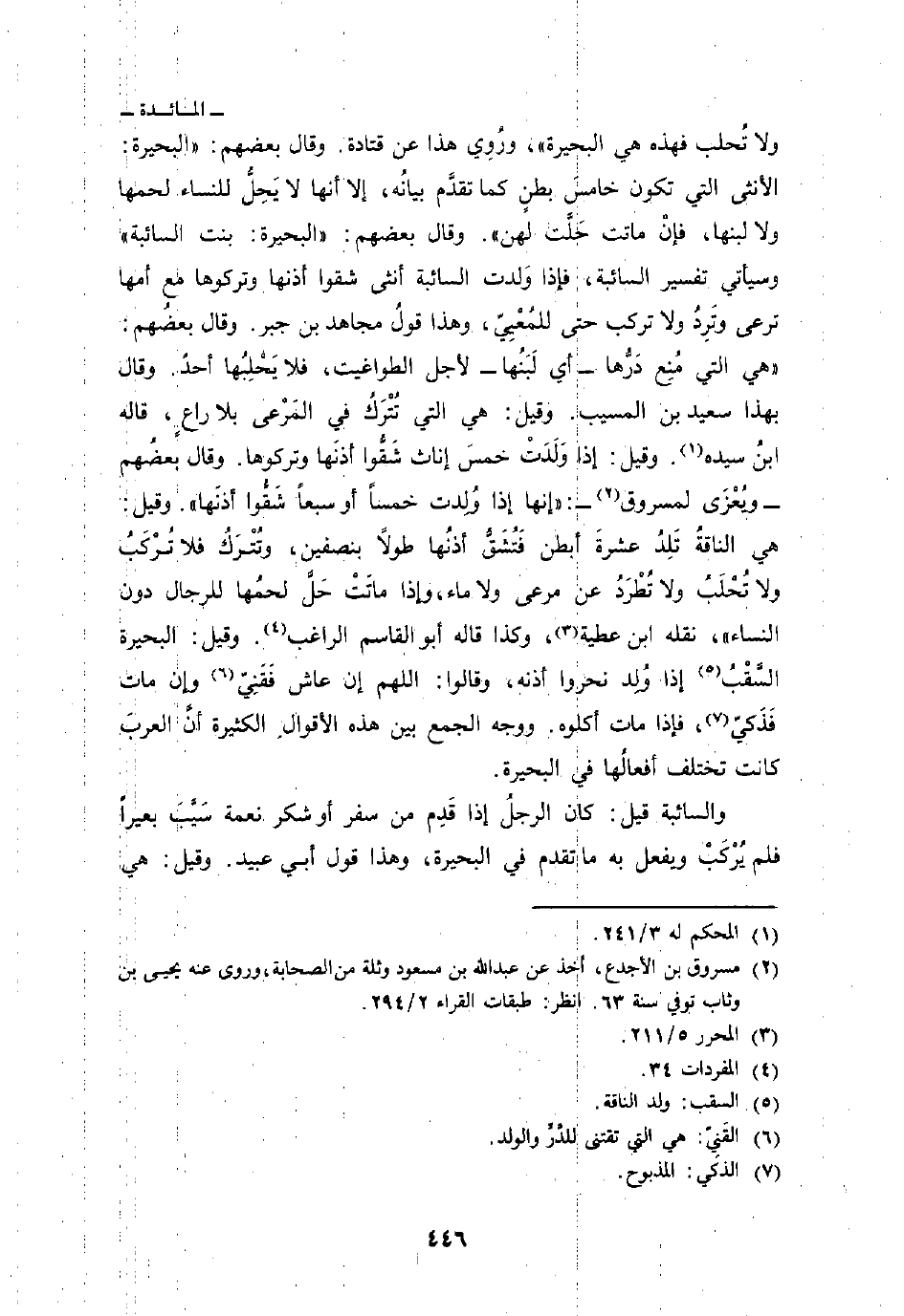 ولا تُحلب فهذه هي البحيرة» ورُوِي هذا عن قتادة. وقال بعضهم: «البحيرة: الأنثى التي تكون خامسَ بطنٍ كما تقدَّم بيانُه، إلا أنها لا يَحِلُّ للنساء لحمها ولا لبنها، فإنْ ماتت حَلَّت لهن» وقال بعضهم: «البحيرة: بنت السائبة» وسأتي تفسير السائبة، فإذا وَلدت السائبة أنثى شقوا أذنها وتركوها مع امها ترعى وتَرِدُ ولا تكرب حتى للمُعْيّي، وهذا قولُ مجاهد بن جبر. وقال بعضُهم: «هي التي مُنِع دَرُّها - أي لَبَنُها - لأجل الطواغيت، فلا يَحْلِبُها أحدٌ. وقال بهذا سعيد بن المسيب. وقيل: هي التي تُتْرَكُ في المَرْعى بلا راعٍ، قاله أبنُ سيده وقيل: إذا وَلَدَتْ خمسَ إناث شَقُّوا أذنَها وتركوها. وقال بعضُهم - ويُعْزَى لمسروق -:» إنها إذا وُلِدت خمساً أو سبعاً شَقُّوا أذنَها «وقيل: هي الناقةُ تَلِدُ عشرةَ أبطن فَتُشَقُّ أذنُها طولاً بنصفين، وتُتْرَكُ فلا تُرْكَبُ ولا تُحْلَبُ ولا تُطْرَدُ عن مرعى ولا ماء، وإذا ماتَتْ حَلَّ لحمُها للرجال دون النساء» ، نقله ابن عطية، وكذا قاله أبو القاسم الراغب.