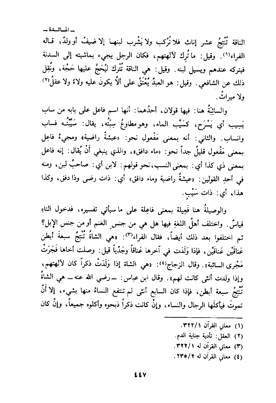 الناقة تُنْتِجُ عشر إناث فلا تُرْكب ولا يَشْرب لبنها إلا ضيفٌ أو ولدٌ، قاله الفراء وقيل: ما تُرِك لآلهتهم، فكان الرجل يجيء بماشيته إلى السدنة فيتركه عندهم ويسيل لبنه. وقيل: هي النقة تُتْرك ليُحَجَّ عليها حَجَّة، ونُقِل ذلك عن الشافعي. وقيل: هوالعبدُ يُعْتَقُ ألاَّ يكونَ عليه ولاءٌ ولا عقلٌ ولا ميراثٌ.