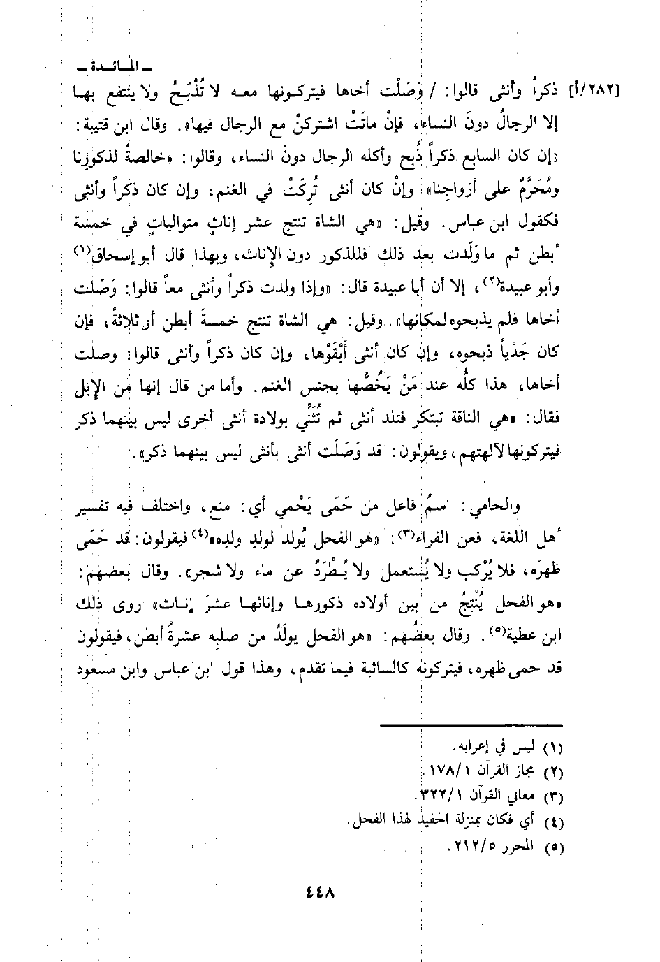 ذكراً وأنثى قالوا: وَصَلت أخاها فيتركونها معه لا تُذْبَحُ ولا ينتفع بها إلا الرجالُ دونَ النساء، فإنْ ماتَتْ اشتركنْ مع الرجال فيها «. وقال ابن قتيبة:» إن كان السابع ذكراً ذُبح وأكله الرجال دونَ النساء، وقالوا: «خالصةٌ لذكورِنا ومُحَرَّمٌ على أزواجِنا» وإنْ كان أنثى تُرِكَتْ في الغنم، وإن كان ذكراً وأنثى فكقول ابن عباس: وقيل: «هي الشاة تنتج عشر إناثٍ متواليِاتٍ في خمسة أبطن ثم ما وَلَدت بعد ذلك فاللذكور دون الإِناث، وبهذا قال أبو اسحاق وأبو عبيدة، إلا ان أبا عبيدة قال:» وإذا ولدت ذكراً وأنثى معاً قالوا: وَصَلت أخاها فلم يذبحوه لمكانها «.