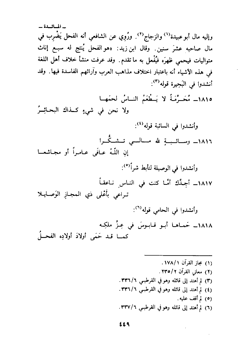وإليه مال أبو عبيدة والزجاج ورُوِي عن الشافعي أنه الفحل يَضْرِب في مال صاحبه عشرَ سنين. وقال ابن زيد: «هو الفحل يُنتج له سبع إناث متواليات فيحمي ظهرَه فيُفْعل به ما تقدم. وقد عرفت منشأ خلاف أهل اللغة في هذه الأشياء أنه باعتبار اختلاف مذاهب العرب وآرائهم الفاسدة فيها. وقد أنشدوا في البَحِيرة قوله: