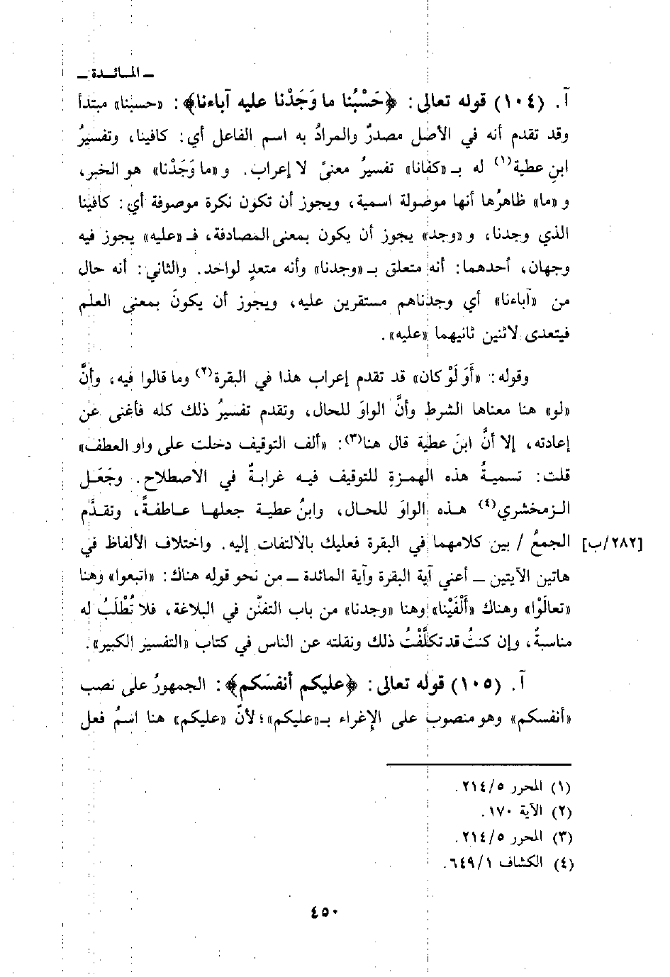 قوله تعالى: {حَسْبُنَا مَا وَجَدْنَا عَلَيْهِ آبَاءَنَآ} : «حسبنا» مبتدأ وقد تقدم أنه في الأصل مصدرٌ والمرادُ به اسم الفاعل أي: كافينا، وتفسيرُ ابن عطية له ب «كفانا» تفسيرُ معنىً لا إعراب. و «ما وَجَدْنا» هو الخبر، و «ما» ظاهرُها أنها موصولة اسمية، ويجوز أن تكون نكرة موصوفة أي: كافينا الذي وجدنا، و «وجد» يجوز أن يكون بمعنى المصادفة، ف «عليه» يجوز فيه وجهان، أحدهما: أنه متعلق ب «وجدنا» وأنه متعدٍ لواحد. والثاني: أنه حال من «آباءنا» أي وجدناهم مستقرين عليه، ويجوز أن يكونَ بمعنى العلم فيتعدى لاثنين ثانيهما «عليه» .