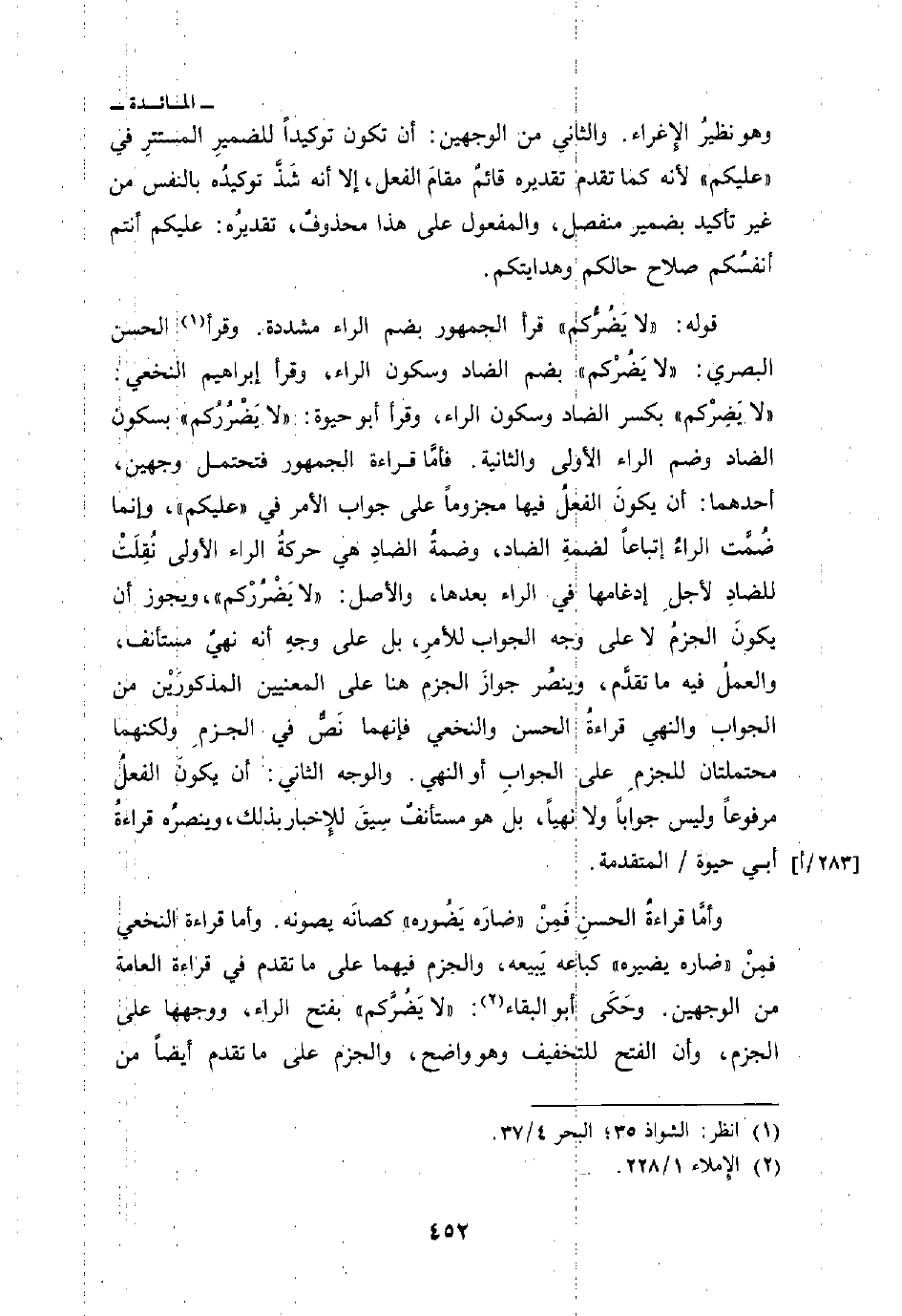 قوله: {لاَ يَضُرُّكُمْ} قرأ الجمهور بضم الراء مشددة. وقرأ الحسن البصري: {لا يَضُرْكم} بضم الضاد وسكون الراء، وقرأ إبراهيم النخعي: {لا يَضِرْكم} بكسر الضاد وسكون الراء، وقرأ أبو حيوة: {لا يَضْرُرُكم} بسكون الضاد وضم الراء الأولى والثانية. فأمَّا قراءة الجمهور فتحتمل وجهين، أحدهما: أن يكونَ الفعلُ فيها مجزوماً على جواب الأمر في» عليكم «وإنما ضُمَّت الراءُ إتباعاً لضمةِ الضاد، وضمةُ الضادِ هي حركةُ الراء الأولى نُقِلَتْ للضادِ لأجلِ إدغامها في الراء بعدها، والأصل: {لا يَضْرُرْكم} ، ويجوز أن يكونَ الجزمُ لا على وجه الجواب للأمرِ، بل على وجهِ أنه نهيٌ مستأنف، والعملُ فيه ما تقدَّم، وينصُر جوازَ الجزم هنا على المعنيين المذكورَيْن من الجواب والنهي قراءةُ الحسن والنخعي فإنهما نَصٌّ في الجزم ولكنهما محتملتان للجزمِ على الجوابِ أو النهي.