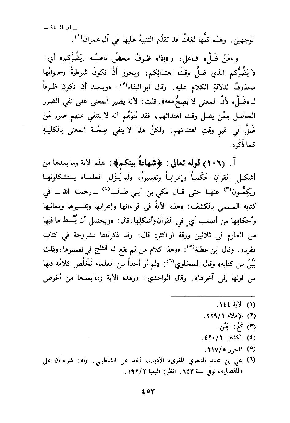 قوله تعالى: {شَهَادَةُ بَيْنِكُمْ} : هذه الآية وما بعدها من أشكلِ القرآنِ حُكْماً وإعراباً وتفسيراً، ولم يَزَلِ العلماء يستشكلونها ويَكِعَّون عنها حتى قال مكي بن أبي طالب - رحمه الله- في كتابه المسمى بالكشف: «هذه الآيةُ في قراءتها وإعرابها وتفسيرها ومعانيها وأحكامِها من أصعب آيٍ في القرآن وأشكلِها، قال:» ويحتمل أن يُبْسط ما فيها من العلوم في ثلاثين ورقة أو أكثر «قال: وقد ذكرناها مشروحة في كتاب مفرد» . وقال ابن عطية: «وهذا كلام من لم يقع له الثلج في تفسيرها، وذلك بَيِّنٌ من كتابه» وقال السخاوي: «لم أر أحداً من العلماء تَخَلَّص كلامُه فيها من أولها إلى آخرها» . وقال الواحدي: «وهذه الآية وما بعدها من أغوص