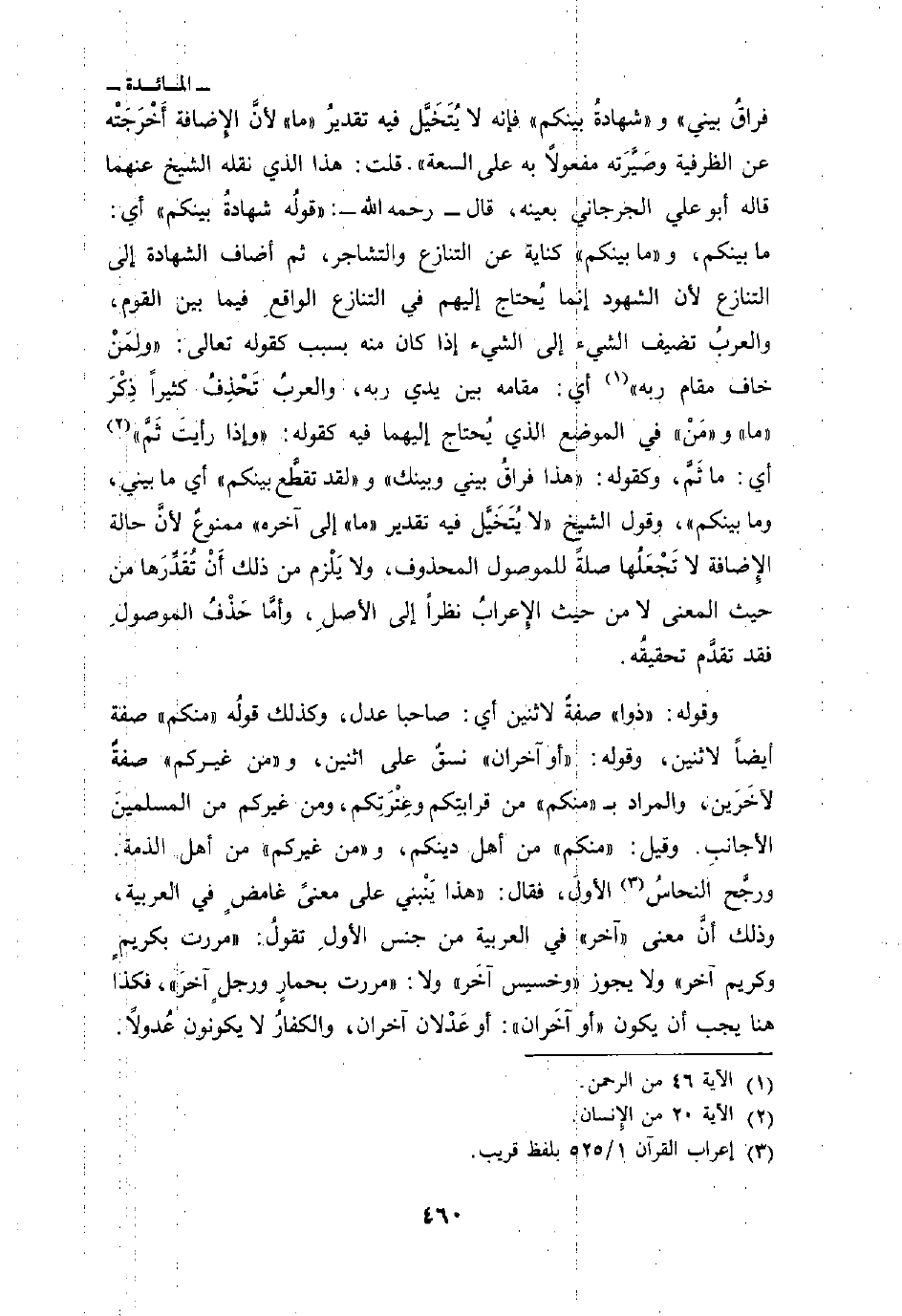 {وَلِمَنْ خَافَ مَقَامَ رَبِّهِِ} [الرحمن: 46] أي: مقامه بين يدي ربه، والعربُ تَحْذِفُ كثيراً ذِكْرَ «ما» و «مَنْ» في الموضع الذي يُحتاج إليهما فيه كقوله: {وَإِذَا رَأَيْتَ ثَمَّ} [الإِنسان: 20] أي: ما ثَمَّ، وكقوله: {هذا فِرَاقُ بَيْنِي وَبَيْنِكَ} و {لَقَد تَّقَطَّعَ بَيْنَكُمْ} أي ما بيني، وما بينكم «، وقول الشيخ» لا يُتَخَيَيَّل فيه تقدير «ما» إلى آخره «ممنوعٌ لأنَّ حالة الإِضافة لا تَجْعَلُها صلةً للموصول المحذوف، ولا يَلْزم من ذلك أَنْ تُقَدِّرَها من حيث المعنى لا من حيث الإِعرابُ نظراً إلى الأصلِ، وأمَّا حَذْفُ الموصولِ فقد تقدَّم تحقيقُه.