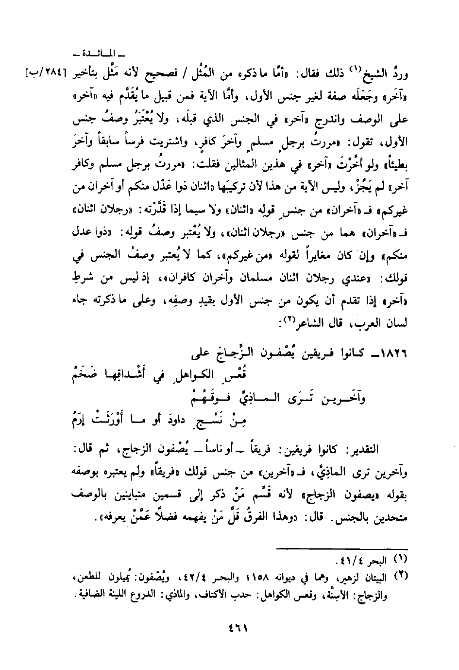 وردَّ الشيخ ذلك فقال: «أمَّا ما ذكره من المُثُل فصحيح لأنه مَثًَّل بتأخير» آخَر «وجَعَلَه صفة لغير جنس الأول، وأمَّا الآية فمن قبيل ما يُقَدَّم فيه» آخر «على الوصف واندرج» آخر «في الجنس الذي قبلَه، ولا يُعْتَبرُ وصفُ جنس الأول، تقول:» مررتُ برجلٍ مسلمٍ وآخرَ كافرٍ، واشتريت فرساً سابقاً وآخرَ بطيئاً «ولو أخَّرْتَ» آخر «في هذين المثالين فقلت:» مررتُ برجل مسلم وكافر آخر «لم يَجُزْ، وليس الآية من هذا لأن تركيبَها» اثنان ذوا عَدْل منكم أو آخران من غيركم «ف» آخران «من جنسِ قوله» اثنان «ولا سميا إذا قَدَّرْته:» رجلان اثنان «ف» آخران «هما من جنس» رجلان اثنان «، ولا يُعتبر وصفُ قولِه:» ذوا عدل منكم «وإن كان مغايراً لقوله» من غيركم «، كما لا يُعتبر وصفُ الجنس في قولك:» عندي رجلان اثنان مسلمان وآخران كافران «، إذ ليس من شرطِ» آخر «إذا تقدم أن يكون من جنس الأول بقيد وصفِه، وعلى ما ذكرته جاء لسان العرب قال الشاعر: