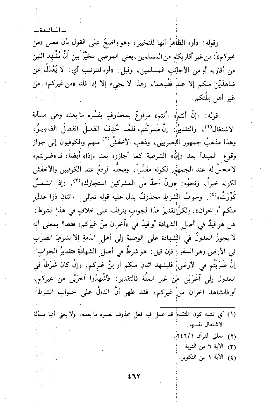 قوله: {إِنْ أَنتُمْ} «أنتم» مرفوعٌ محذوفٍ يفسِّره ما بعده وهي مسألة الاشتغال، والتقديرُ: إنْ ضَرَبْتُم، فلمَّا حُذِفَ الفعلُ انفصلَ الضميرُ، وهذا مذهبُ جمهور البصريين، وذهب الأخفشُ منهم والكوفيون إلى جواز وقوعِ المبتدأ بعد «إنْ» الشرطية كما أجازوه بعد «إذا» أيضاً، ف «ضربتم» لا محلَّ له عند الجمهور لكونه مفسِّراً، ومحلُّه الرفعُ عند الكوفيين والأخفش لكونه خبراً، ونحوُه: {وَإِنْ أَحَدٌ مِّنَ المشركين استجارك} [التوبة: 6] ، {إِذَا الشمس كُوِّرَتْ} [التكوير: 1] . وجوابُ الشرطِ محذوفٌ يدل عليه قوله تعالى: {اثنان ذَوَا عَدْلٍ مِّنْكُمْ أَوْ آخَرَانِ} ولكنَّ تقديرَ هذا الجوابِ يتوقف على خلافٍ في هذا الشرط: هل هو قيدٌ في أصلِ الشهادة أو قيدٌ في «آخران مِنْ غيركم» فقط؟ بمعنى أنه لا يجوزُ العدولُ في الشهادة على الوصية إلى أهلِ الذمةِ إلا بشرطِ الضربِ في الأرض وهو السفر. فإن قيل: هو شرطٌ في أصلِ الشهادةِ فتقديرُ الجوابِ: إنْ ضَرَبْتُم في الأرضِ فليشهد اثنانِ منكم أو مِنْ غيركم، وإنْ كان شَرَطاً في العدول إلى آخَرَين من غير الملَّة فالتقدير: فأشْهِدُوا آخَرَيْن من غيركم، أو فالشاهد آخران من غيركم، فقد ظهر انَّ الدالَّ على جواب الشرط: