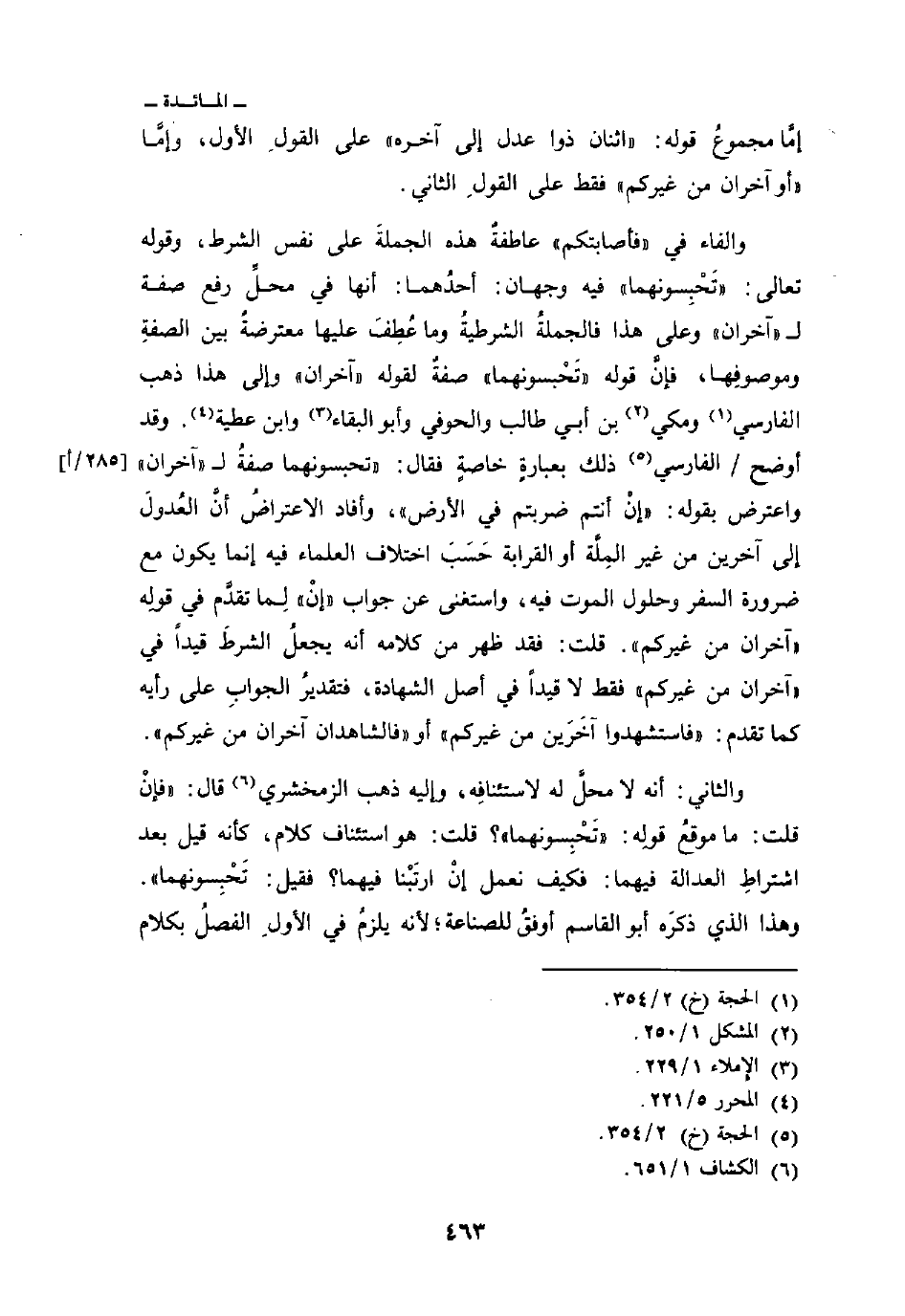 والفاء في «فأصابتكم» عاطفةٌ هذه الجملةَ على نفس الشرط، وقوله تعالى: {تَحْبِسُونَهُمَا} فيه وجهان: أحدُهما: أنها في محلِّ رفع صفةَ ل «آخران» وعلى هذا فالجملةُ الشرطيةُ وما عُطِفَ عليها معترضةٌ بين الصفةِ وموصوفِها، فإنَّ قوله «تَحْبسونهما» صفةٌ لقوله «آخران» وإلى هذا ذهب الفارسي ومكي بن أبي طالب والحوفي وأبو البقاء وابن عطية وقد أوضح الفارسي ذلك بعبارةٍ خاصةٍ فقال: «تحبسونهما صفةُ ل» آخران «واعترض بقوله: {إِنْ أَنتُمْ ضَرَبْتُمْ فِي الأرض} وأفاد الاعتراضُ أنَّ العُدولَ إلى آخرين من غير المِلَّة أو القرابة حَسَبَ اختلاف العلماء فيه إنما يكون مع ضرورة السفر وحلول الموت فيه، واستغنى عن جواب» إنْ «لِما تقدَّم في قولِه» آخران من غيركم «قلت: فقد ظهر من كلامه أن يجعلُ الشرطَ قيداً في» آخران من غيركم «فقط لا قيداً في أصل الشهادة، فتقديرُ الجوابِ على رأيه كما تقدم:» فاستشهدوا آخَرَين من غيركم «أو» فالشاهدان آخران من غيركم «.
