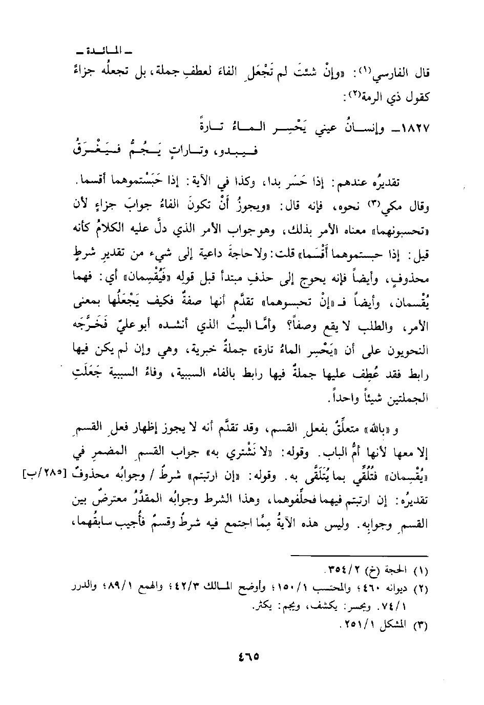 تقديرُه عندهم: إذا حَسَرَ بدا، وكذا في الآية: إذا حَبَسْتموهما أقسما. وقال مكي نحوه، فإنه قال: و» يجوزُ اَنْ تكونَ الفاءُ جوابَ جزاءٍ لأن «تحسبونهما» معناه الأمر بذلك، وهو جواب الأمر الذي دلَّ عليه الكلامُ كأنه قل: إذا حبستموهما أَقْسَما «قلت: ولا حاجةَ داعية إلى شيء من تقديرِ شرطٍ محذوفٍ، وأيضاً فإنه يحوج إلى حذفِ مبتدأ قبل قولِه {فَيُقْسِمَانِ} أي: فهما يُقْسمان، وأيضاً ف» إنْ تحبسوهما «تقدَّم أنها صفةٌ فكيف يَجْعَلُها بمعنى الأمر، والطلب لا يقع وصفاً؟ وأمَّا البيتُ الذي أنشده أبو عليّ فَخَرَّجَه النحويون على ان» يَحْسِر الماءُ تارة «جملةٌ خبرية، وهي إن لم يكن فيها رابط فقد عُطِف عليها جملةٌ فيها رابط بالفاء السببية، وفاءُ السببية جَعَلَتِ الجملتين شيئاً واحداً.