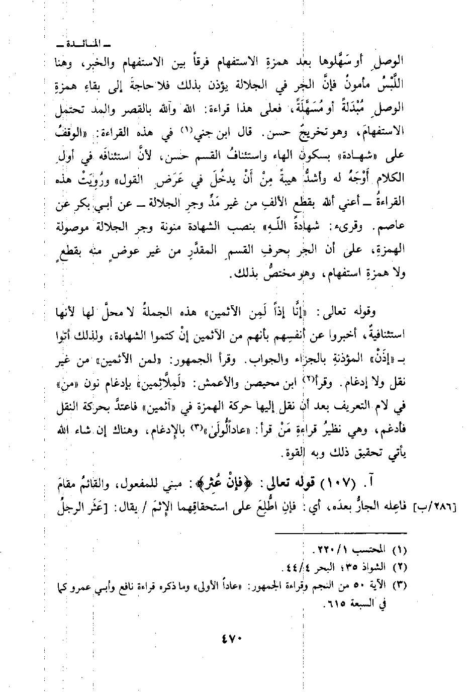 قال ابن جني في هذه القراءة: «الوقفُ على» شهادة «بسكون الهاء واستئنافُ القسم، حسن، لأنَّ استئنافَه في أولِ الكلام أَوْجَهُ له وأشدُّ هيبةً مِنْ يدخُلَ في عَرَضِ القول» ورُوِيَتْ هذه القراءةُ - أعني ألله بقطع الألفِ من غير مَدِّ وجرِ الجلالة - عن أبي بكر عن عاصم وقرئ: شهادةً اللهِ «بنصب الشهادة منونة وجر الجلالة موصولة الهمزةِ، على أن الجر بحرفِ القسمِ المقدِّرِ من غير عوضٍ منه بقطعٍ ولا همزةِ استفهام، وهو مختصٌّ بذلك.