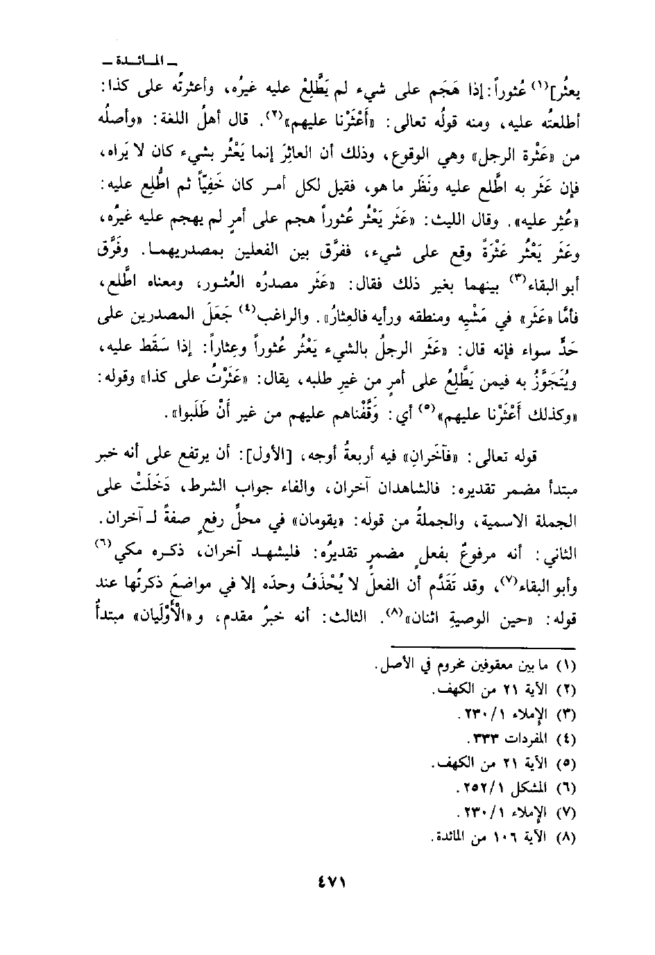 يعثُر] عُثوراً: إذا هَجَم على شيء لم يَطَّلِعْ عليه غيرُه، وأعثرتُه على كذا: أطلعتُه عليه، ومنه قولُه تعالى: {أَعْثَرْنَا عَلَيْهِمْ} [الكهف: 21] . قال أهلُ اللغة: «وأصلُه من» عَثْرة الرجل «وهي الوقوع، وذلك أن العاثِرَ إنما يَعْثُر بشي كان لا يَراه، فإن عَثَر به اطِّلع عليه ونَظَر ما هو، فقيل لكل أمر كان خَفِيّاً ثم اطُّلِع عليه:» عُثِر عليه «وقال الليث:» عَثَر يَعْثُر عُثوراً هجم على أمرٍ لم يهجم عليه غيرُه، وعَثَر يَعْثُر عَثْرَةً وقع على شيء، ففرَّق بين الفعلين بمصدريهما. وفَرَّق أبو البقاء بينهما بغير ذلك فقال: «عَثَر مصدرُه العُثور، ومعناه اطَّلع، فأمَّا» عَثَر «في مَشْيِة ومنطقه ورأيه فالعِثارُ» والراغب جَعَل المصدرين على حَدِّ سواء فإنه قال: «عَثَر الرجلُ بالشيء يَعْثُر عُثوراً وعِيثاراً: إذا سَقَط عليه، ويُتَجَوًَّزُ به فيمن يَطِّلِعُ على أمرٍ من غيرِ طلبه، يقال:» عَثَرْتُ على كذا «وقوله: {وكذلك أَعْثَرْنَا عَلَيْهِمْ} [الكهف: 21] أي: وَقَّفْناهم عليهم من غير أَنْ طَلَبوا» .