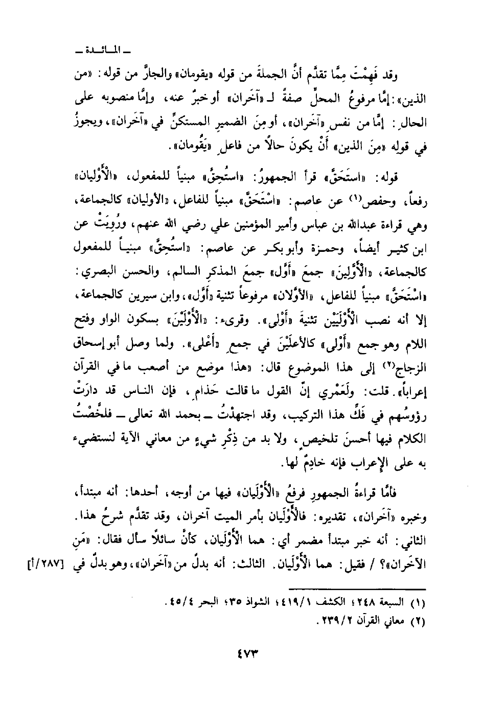 وقد فَهِمْتَ مِمَّا تقدَّم أنَّ الجملةَ من قوله «يقومان» والجارَّ من قوله: {مِنَ الَّذينَ} : إمَّا مرفوعٌ المحلِّ صفةً ل «آخَران» أو خبرٌ عنه، وإمَّا منصوبة على الحالِ: إمَّا من نفس «آخران» ، أو مِنَ الضمير المستكنِّ في «آخران» ويجوزُ في قولِه {مِنَ الذين} أَنْ يكونَ حالاً من فاعلِ «يَقُومان» .