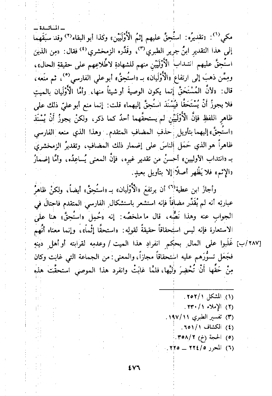 مكي: «تقديرُه: استُحِقَ عليهم إثمُ الأَوْلَيَيْن» وكذا أبو البقاء وقد سبَقَهما إلى هذا التقديرِ ابنُ جرير الطبري وقَدَّره الزمخشري فقال: «مِن الذين استُحِقَّ عليهم انتداب الأَوْلَيَيْن منهم للشهادةِ لاطِّلاعِهم على حقيقةِ الحال» ، ومِمَّن ذهبَ إلى ارتفاع «الأَوْلَيَيْنِ» ب «استُحِقَّ» أبو علي الفارسي ثم منَعه، قال: «لأنَّ المُسْتَحَقَّ إنما يكون الوصية أو شيئاً منها، وأمَّا الأَوْلَيان بالميتِ فلا يجوزُ أَنْ يُسْتَحَقَّا فيُسْنَدَ استُحِقَّ إليهما» قلت: إنما منع أبو عليّ ذلك على ظاهرِ اللفظِ فإنَّ الأَوْلَيَيْنِ لم يستحقَهما أحدٌ كما ذكر، ولكنْ يجوزُ أَنْ يُسْنَدَ «استُحِقَّ» إليهما بتأويلِ حذفِ المضافِ المتقدم.