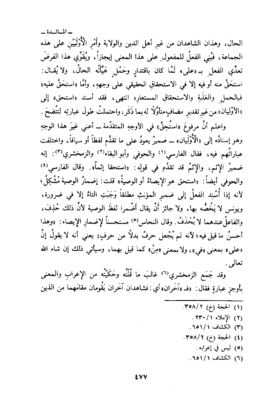 الحال، وهذان الشاهدان من غير أهل الدين والولاية وأَمْرِ الأَوْلَيَيْنِ على هذه الجماعة، فبُنِي الفعلُ للمفعولِ على هذا المعنى إيجازاً، ويُقَوِّي هذا الفرضَ تعدِّي الفعلِ ب» على «لَمَّا كان باقتدارٍ وحَمْلٍ هَيَّأَتْه الحالُ، ولا يُقال: استحَقَّ منه أو فيه إلا في الاستحقاقِ الحقيقي على وجههِ، وأمَّا» استحَقَّ عليه «فبالحملِ والغلَبِة والاستحقاقِ المستعارِ» انتهى، فقد أسند «استحق» إلى الأوْليان «من غيرِ تقديرِ مضافٍ متأوِّلاً له بما ذَكَر، واحتملتُ طولَ عبارتِه لتتَّضحَ.
