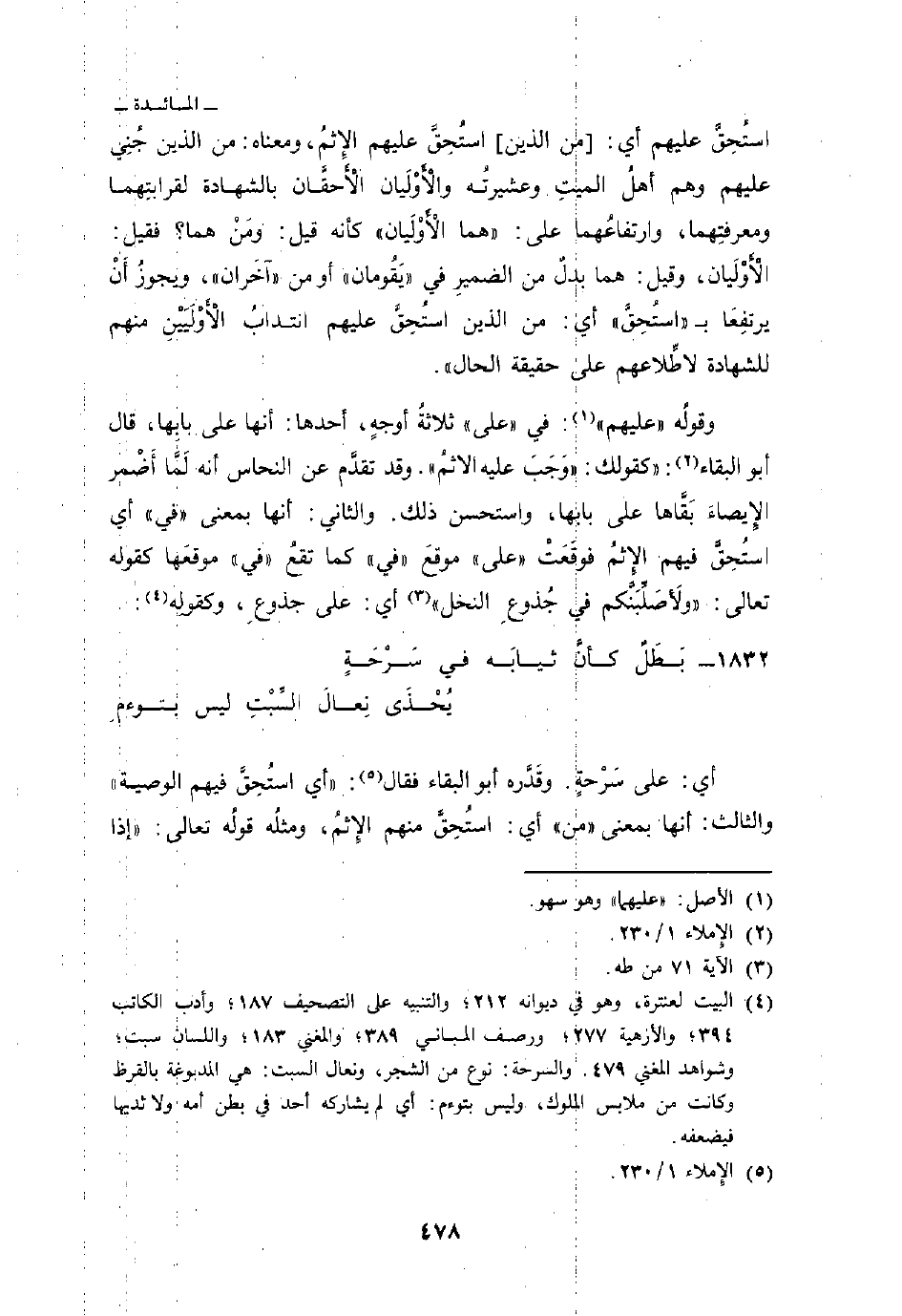 أي: على سَرْحةٍ. وقَدَّره أبو البقاء فقال:» أي استُحِقَّ فيهم الوصية «والثالث: أنها بمعنى» من «أي: استُحِقَّ منهم الإِثمُ، ومثلُه قولُه تعالى: {إِذَا