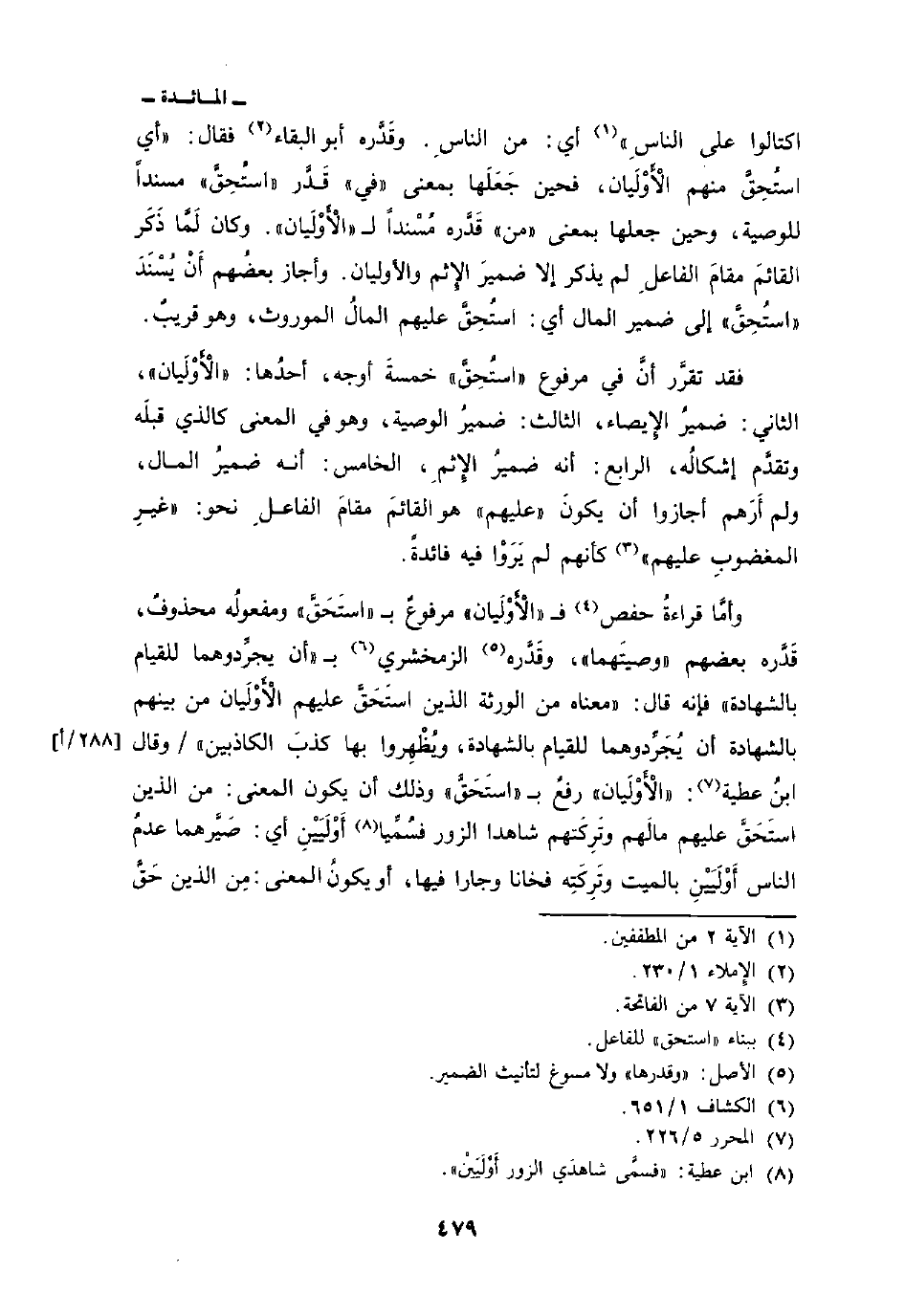 اكتالوا عَلَى الناس} [المطففين: 2] أي: من الناسِ. وقَدَّره أبو البقاء فقال:» اي استُحِقَّ منهما الأوْلَيان، فحين جَعَلها بمعنى «في» قَدَّر «استُحِقَّ» مسنداً للوصية، وحين جعلها بمعنى «من» قَدَّره مُسْنداً ل «الأَوْلَيان» وكان لَمَّا ذَكَر القائمَ مقامَ الفاعلِ لم يذكر إلا ضميرَ الإِثم والأوليان. وأجاز بعضُهم أَنْ يُسْندَ «استُحِقَّ» إلى ضمير المال أي: استُحِقَّ عليهم المالُ الموروث، وهو قريبٌ.