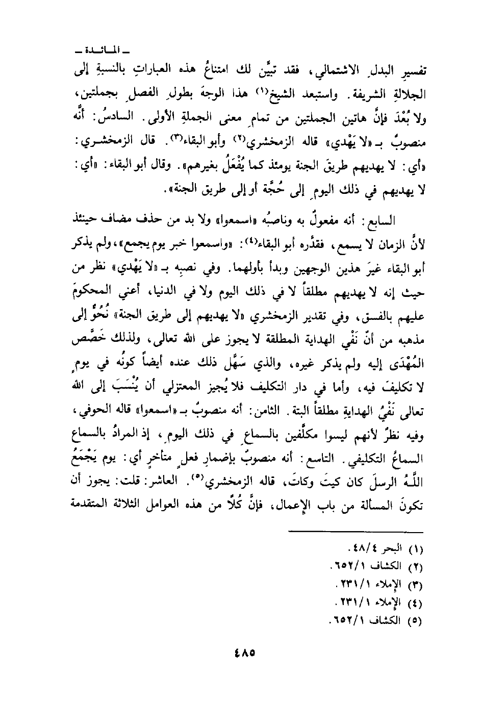 تفسيرِ البدلِ الاشتمالي، فقد تبيَّن لك امتناعُ هذه العباراتِ بالنسبةِ إلى الجلالةِ الشريفة. واستبعد الشيخ هذا الوجهَ بطولِ الفصلِ بجملتين، ولا بُعْدَ فإنَّ هاتين الجملتين من تمامِ معنى الجملةِ الأولى. السادسُ: أنَّه منصوبٌ ب «لا يَهْدي» قال الزمخشري وأبو البقاء. قال الزمخشري: «أي: لا يهديهم طريقَ الجنة يومئذ كما يُفْعَلُ بغيرهم» . وقال أبو البقاء: «أي: لا يهديهم في ذلك اليومِ إلى حُجَّة أو إلى طريق الجنة» .