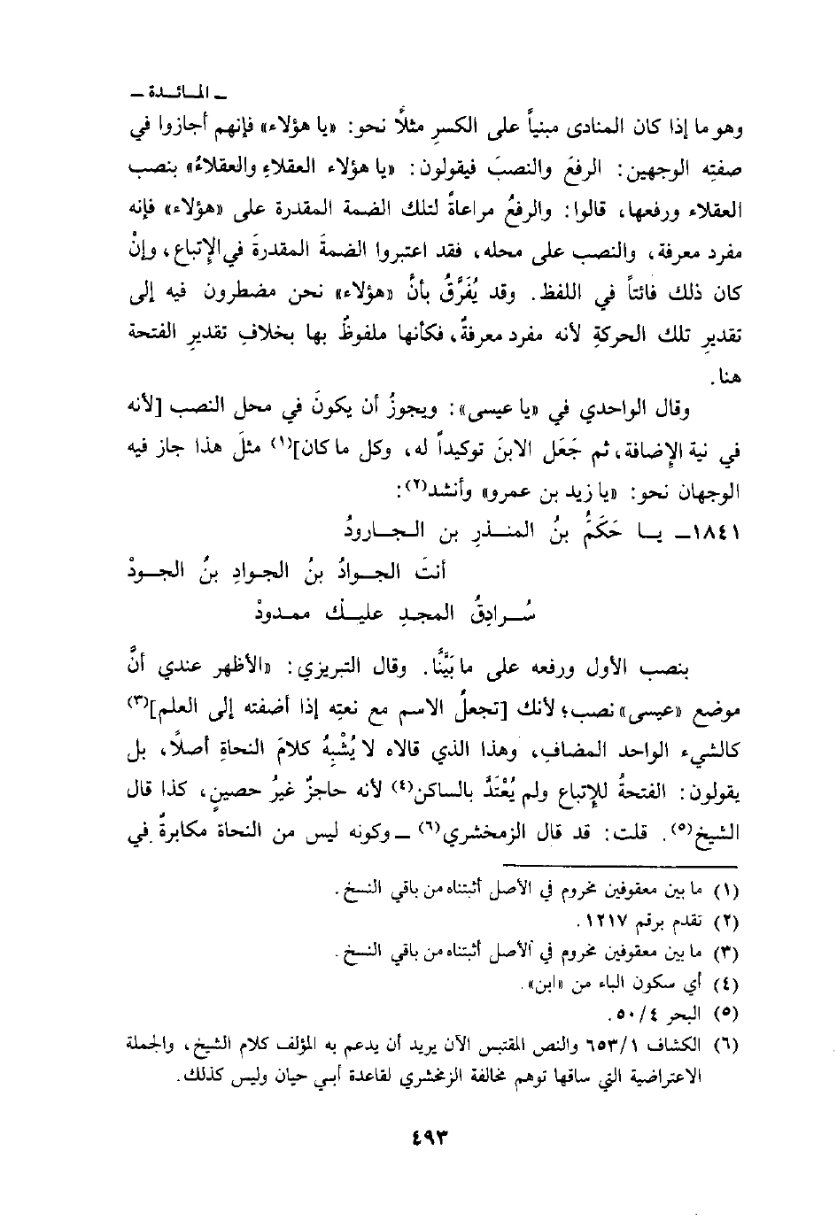 سُرادِقُ المجدِ عليك ممدودْ ... بنصب الأول ورفعه على ما بَيَّنَّا. وقال التبريزي: «الأظهر عندي أنَّ موضع» عيسى «نصب؛ لأنك [تجعلُ الاسم مع نعتِه إذا أضفته إلى العلم] كالشيء الواحد المضافِ، وهذا الذي قالاه لا يُشْبِهُ كلامَ النحاةِ أصلاً، بل يقولون: الفتحةُ للإِتباع ولم يُعْتَدَّ بالساكن لأنه حاجزٌ غيرُ حصينٍ، كذا قال الشيخ. قلت: قد قال الزمخشري - وكونه ليس من النحاة مكابرةٌ في