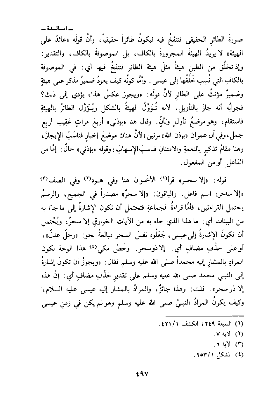 صورةَ الطائرِ الحقيقي فتنفخُ فيه فيكونُ طائراً حقيقياً، وأنَّ قوله «عائدٌ على الهيئة» لا يريدُ الهيئةَ المجرورةَ بالكاف، بل الموصوفةَ بالكاف، والتقدير: وإذ تخلُق من الطينِ هيئةً مثلَ هيئة الطائر فتنفخُ فيها أي: في الموصوفة بالكافِ التي نُسِب خَلْقُها إلى عيسى. وأمَّا كونُه كيف يعودُ ضميرٌ مذكر على هيئةٍ وضميرٌ مؤنثٌ عل الطائرِ لأنَّ قوله: «ويجوز عكسُ هذا» يؤدي إلى ذلك «فجوابُه أنه جازَ بالتأويل، لأنه تُؤَوَّلُ الهيئةُ بالشكل ويُؤَوَّل الطائرُ بالهيئةِ فاستقام، وهو موضعُ تأولٍ وتأنٍ. وقال هنا» بإذني «أربعَ مراتٍ عَقِيب أربع جمل، وفي آل عمران» بإذن الله «مرتين؛ لأنَّ هناك موضعَ إخبارٍ فناسَبَ الإِيجازَ، وهنا مقامُ تذكيرٍ بالنعمةِ والامتنانِ فناسبَ الإِسهابَ؛ وقوله:» بإذني «حالٌ: إمَّا من الفاعلِ أو من المفعول.