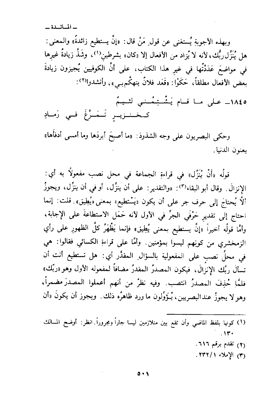وبهذه الأجوبةِ يُستغنى عن قولِ مَنْ قال:» إنَّ يستطيع زائدةٌ «والمعنى: هل يُنَزَّل ربُّك، لأنه لا يُزال من الأفعال إلا» كان «بشرطينِ وشَذَّ زيادةُ غيرِها في مواضعَ عَدَدْتُها في غيرِ هذا الكتاب، على أنَّ الكوفيين يُجيزون زيادةَ بعض الأفعال مطلقاً، حَكَوْا: قَعَدَ فلانٌ يتهكَّم بي» ، وأنشدوا: