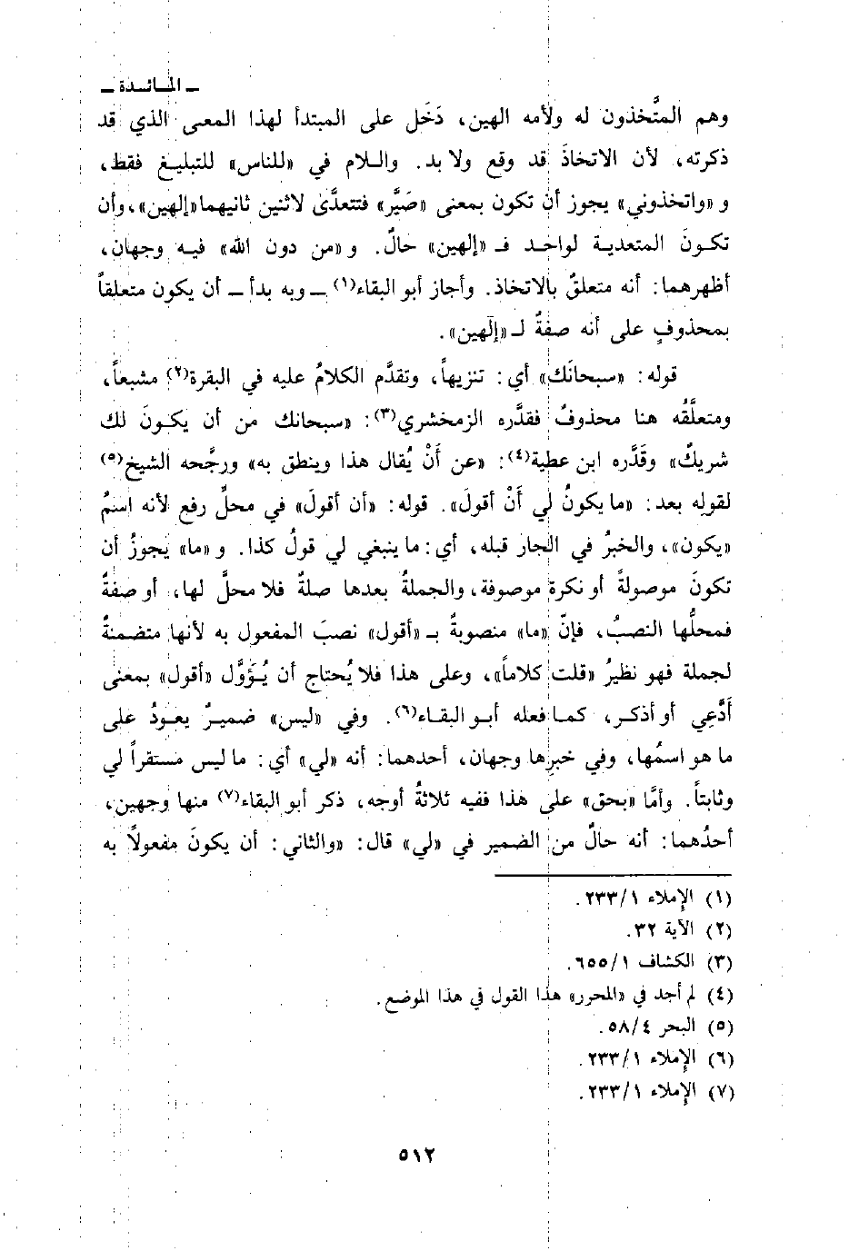 قوله: {سُبْحَانَكَ} أي: تنزيهاً، وتقدَّم الكلامُ عليه في البقرة مشبعاً، ومتعلَّقُه هنا محذوفٌ فقدَّره الزمخشري: سبحانك من أن يكونَ لك شريكٌ «وقَدَّره ابن عطية:» عن أَنْ يُقال هذا وينطق به «ورجَّحه الشيخ لقوله بعد: {مَا يَكُونُ لي أَنْ أَقُولَ} قوله: {أَنْ أَقُول} في محلِّ رفع لأنه اسمُ» يكون «، والخبرُ في الجار قبله، أي: ما ينبغي لي قولُ كذا. و» ما «يجوزُ أن تكونَ موصولةً أن نكرةً موصوفة. والجملةُ بعدها صلةٌ فلا محلَّ لها، أو صفةٌ فمحلُّها النصبُ، فإنّ» ما «منصوبةٌ ب» اقول «نصبَ المفعول به لأنها متضمنةٌ لجملة فهو نظيرُ» قلت كلاماً «، وعلى هذا فلا يُحتاج أن يُؤَوَّل» أقول «بمعنى أَدَّعِي أو أذكر، كما فعله أبو البقاء. وفي» ليس «ضميرٌ يعودُ على ما هو اسمُها، وفي خبرِها وجهان، أحدهما: أنه» لي «أي: ما ليس مستقراً لي وثابتاً، وأمَّا» بحق «على هذا ففيه ثلاثةُ أوجه، ذكر أبو البقاء منها وجهين، احدُهما أنه حالٌ من الضمير في» لي «قال: والثاني: أن يكونَ مفعولاً به