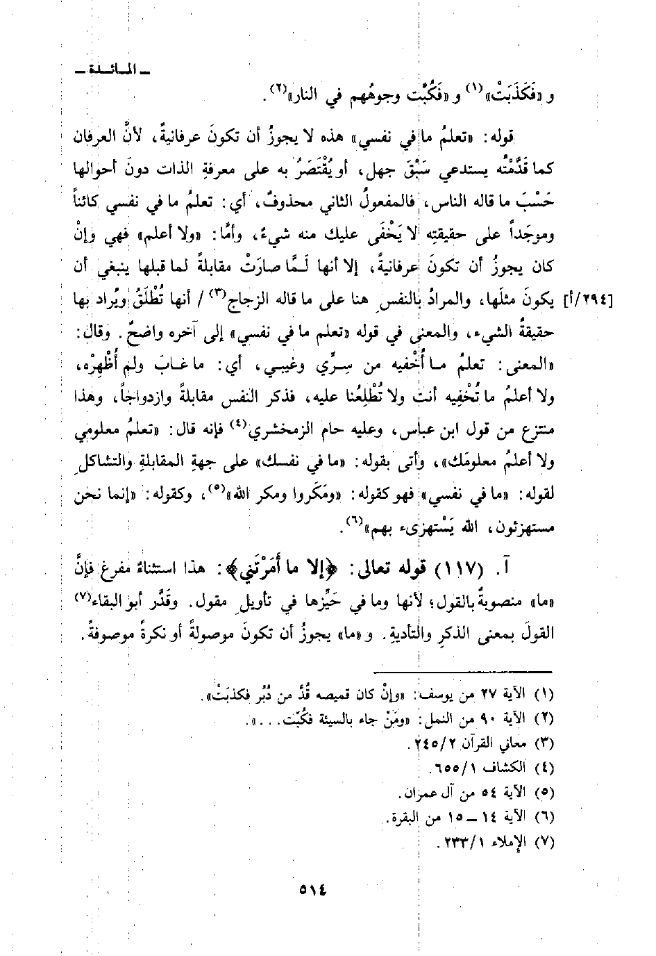 قوله: {تَعْلَمُ مَا فِي نَفْسِي} هذه لا يجوزُ أن تكونَ عرفانيةً، لأنَّ العرفان كما قَدَّمْتُه يستدعي سَبْقَ جهل، او يُقْتَصَرُ به على معرفةِ الذات دونَ أحوالها حَسْبَ ما قاله الناس، فالمفعولُ الثاني محذوفٌ، أي: تعلمُ ما في نفسي كائناً وموجَداً على حقيقتِه لا يَخْفَى عليك منه شيءٌ، وأمَّا:» ولا أعلم «فيه وإنْ كان يجوزُ أن تكونَ عرفانيةً، إلا أنها لَمَّا صارَتْ مقابلةً لما قبلها ينبغي أن يكونَ مثلَها، والمرادُ بالنفسِ هنا على ما قاله الزجاج» انها تُطْلَقُ ويُراد بها حيققةُ الشي، والمعنى في قوله {تَعْلَمُ مَا فِي نَفْسِي} إلى آخره واضحٌ، وقال: «المعنى: تعلمُ ما أُخْفيه من سِرِّي وغيبي، أي: ما غابَ ولم أُظْهِرْه، ولا أعلمُ ما تُخفِيه أنت ولا تُطْلِعُنا عليه، فذكرالنفس مقابلةً وازداجاً، وهذا منتزع من قول ابن عباس، وعليه حام الزمخشري فإنه قال:» تعلمُ معلومي ولا أعلمُ معلومَك «، وأتى بقوله: {مَا فِي نَفْسِكَ} على جهةِ المقابلةِ والتشاكلِ لقوله: {مَا فِي نَفْسِي} فهو كقوله: