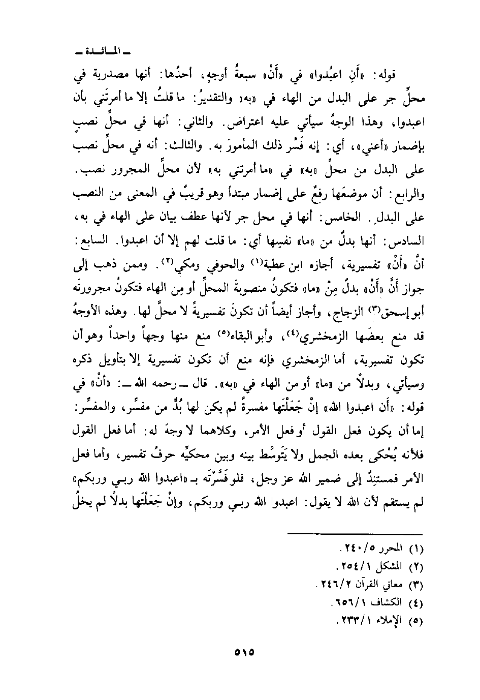 قوله: {أَنِ اعبدوا} في «أَنْ» سبعةُ أوجهٍ، أحدُها: أنها مصدرية في محلِّ جر على البدل من الهاء في «به» والتقديرُ: ما قلتُ إلا ما أمرتَني بأن اعبدوا، وهذا الوجهُ سيأتي عليه اعتراض. والثاني: أنها في محلِّ نصبٍ بإضمار «أعني» ، أي: إنه فَسَّر ذلك المأمورَ به. والثالث: أنه في محلِّ نصب على البدل من محلِّ «به» في «ما أمرتني به» لأن محلِّ المجرور نصب. والرابع: أن موضعَها رفعٌ على إضمار مبتدأ وهو قريبٌ في المعنى من النصب على البدلِ الخامس: أنها في محل جر لأنها عطف بيان على الهاء في به، السادس: أنها بدلٌ من «ما» نفسِها أي: ما قلت لهم إلا أن اعبدوا. السابع: أنَّ «أَنْ» تفسيرية، أجازه ابن عطية والحوفي ومكي. وممن ذهب إلى جوز أَنَّ «أَنْ» بدلٌ مِنْ «ما» فتكونُ منصوبةَ المحلِّ أو مِن الهاء فتكونُ مجرورتَه أبو إسحق الزجاج، وأجاز أيضاً أن تكونَ تفسيريةً لا محلَّ لها. وهذه الأوجهُ قد منع بعضَها الزمخشري، وأبو البقاء منع منها وجهاً واحداً وهو أن تكون تفسيرية، أما الزمخشري فإنه منع أن تكون تفسيرية إلا بتأويل ذكره وسيأتي، وبدلاً من «ما» أو من الهاء في «به» . قال - رحمه الله -: «أنْ» في قوله: {أَنِ اعبدوا الله} إنْ جَعَلْتَها مفسرةً لم يكن لها بُدٌّ من مفسِّر، والمفسِّر: إما أن يكون فعل القول أو فعل الأمر، وكلاهما لا وجهَ له: أما فعل القول فلأنه يُحْكى بعده الجمل ولا يَتَوسَّط بينه وبين محكيَّه حرفُ تفسير، وأما فعل الأمر فمستنِدٌ إلى ضمير الله عز وجل، فلو فِسَّرْتَه ب «اعبدوا الله ربي وربكم» لم يستقم لأن الله لا يقول: «اعبدوا الله ربي وربكم، وإنْ جَعَلْتَها بدلاً لم يخلُ