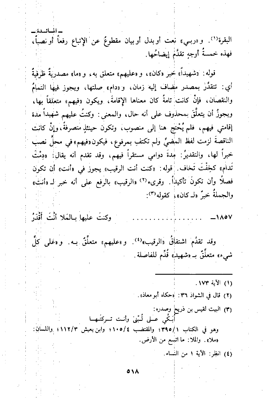 قوله: {شَهِيداً} خبر «كان» و «عليهم» متعلق به، و «ما» مصدريةٌ ظرفيةٌ أي: تتقدَّر بمصدر مضاف إليه زمان، و «دام» صلتها، ويجوز فيها التمامُ والنقصان، فإنْ كانت تامةً كان معناها الإِقامةَ، ويكون «فيهم» متعلقاً بها، ويجوزُ أن يتعلَّقَ بمحذوف على أنه حال، والمعنى: وكنتُ عليهم شهيداً مدة إقامتي فيهم، فلم يُحْتج هنا إلى منصوب، وتكون حينئذٍ متصرفةً، وإنْ كانت الناقصةَ لزمت لفظ المضيِّ ولم تكتفِ بمرفوع، فيكون «فيهم» في محلِّ نصب خبراً لها، والتقديرُ: مدةَ دوامي مستقراً فيهم، وقد تقدم أنه يقال: «دِمْتَ تَدام» كخِفْتَ تَخاف. قوله: {كُنتَ أَنتَ الرَّقِيبَ} يجوز في «أنت» أن تكون فصلاً وأن تكونَ تأكيداً. وقرئ «الرقيب» بالرفع على أنه خبر ل «أنت» والجملةُ خبرٌ «ل كان» ، كقوله:
